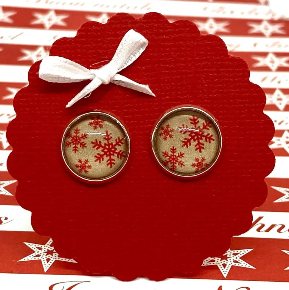 Diese winterlichen Cabochon-Ohrringe – Motiv: rote Schneeflocken auf braun – haben eine silberfarbene Fassung. Sie sind mit Silikonstoppern versehen.