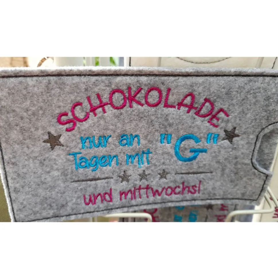In die Hülle passt eine handelsübliche rechteckige 100gr Schokoladentafel. Ferne fertige ich nach Farbwünschen an.