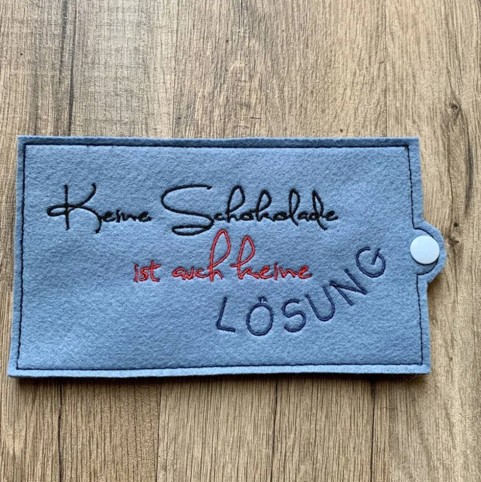 Die Schokoladenhülle ist aus Filz gefertigt und bei 30 Grad im Schonwaschgang waschbar. Sie wird praktisch mit einem Druckknopf verschlossen. Auf den Filz ist der originelle Spruch „keine Schokolade ist auch keine Lösung“ aufgestickt – ein echter Hingucker für jede Gelegenheit.