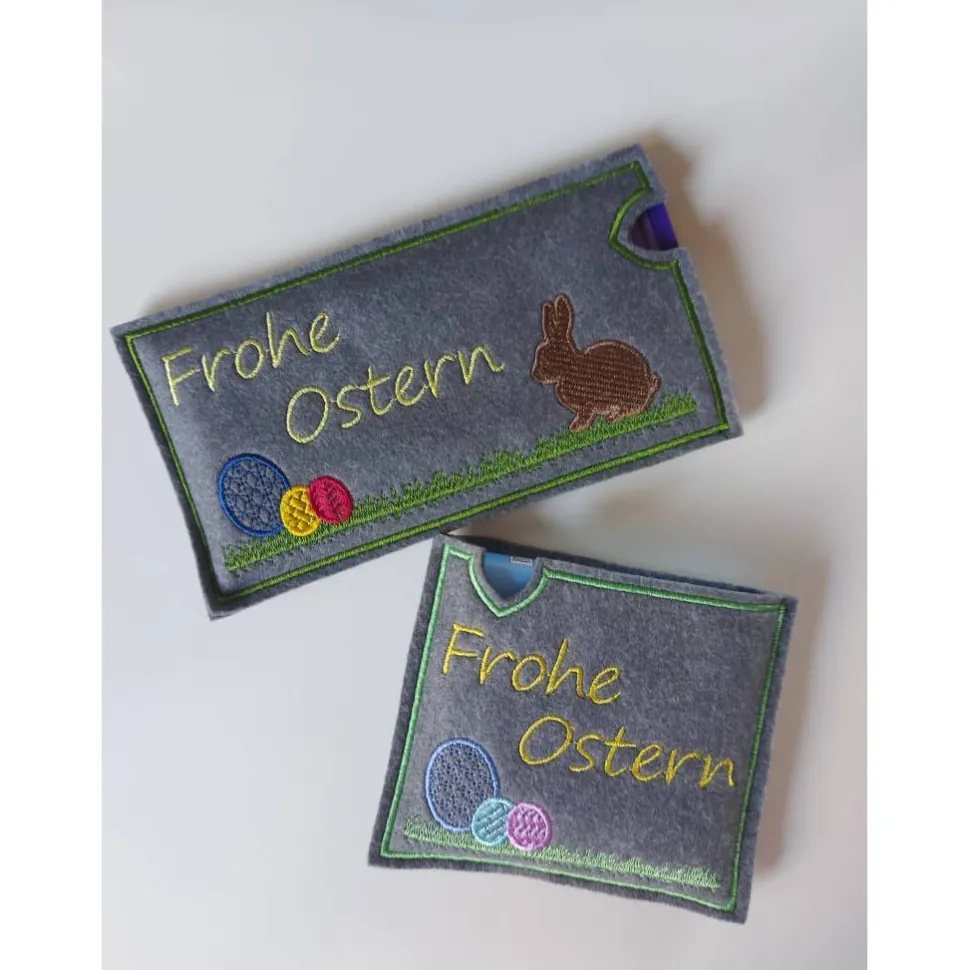 Diese liebevoll selbst gestickten Schokoladenhüllen aus hochwertigem Filz verwandeln eine einfache Tafel Schokolade im Handumdrehen in ein persönliches Osterhighlight. Mit dem fröhlichen „Frohe Ostern“-Schriftzug, bunten Ostereiern und dem kleinen Hasen auf der Wiese sorgen sie sofort für Frühlingsstimmung.