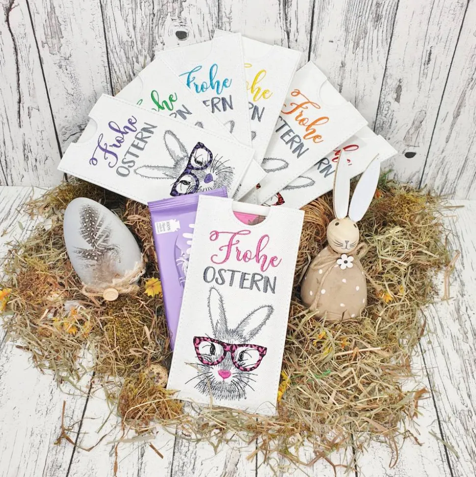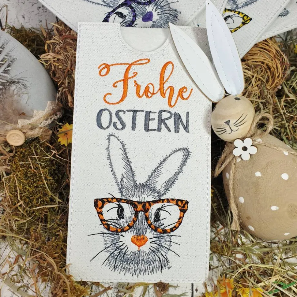Diese Hülle ist eine originelle Geschenkverpackung zu Ostern mit einem lustigen Häschchen mit Brille und süßer Stupsnase.