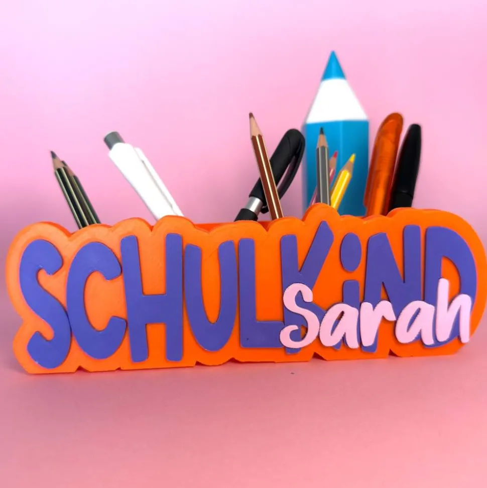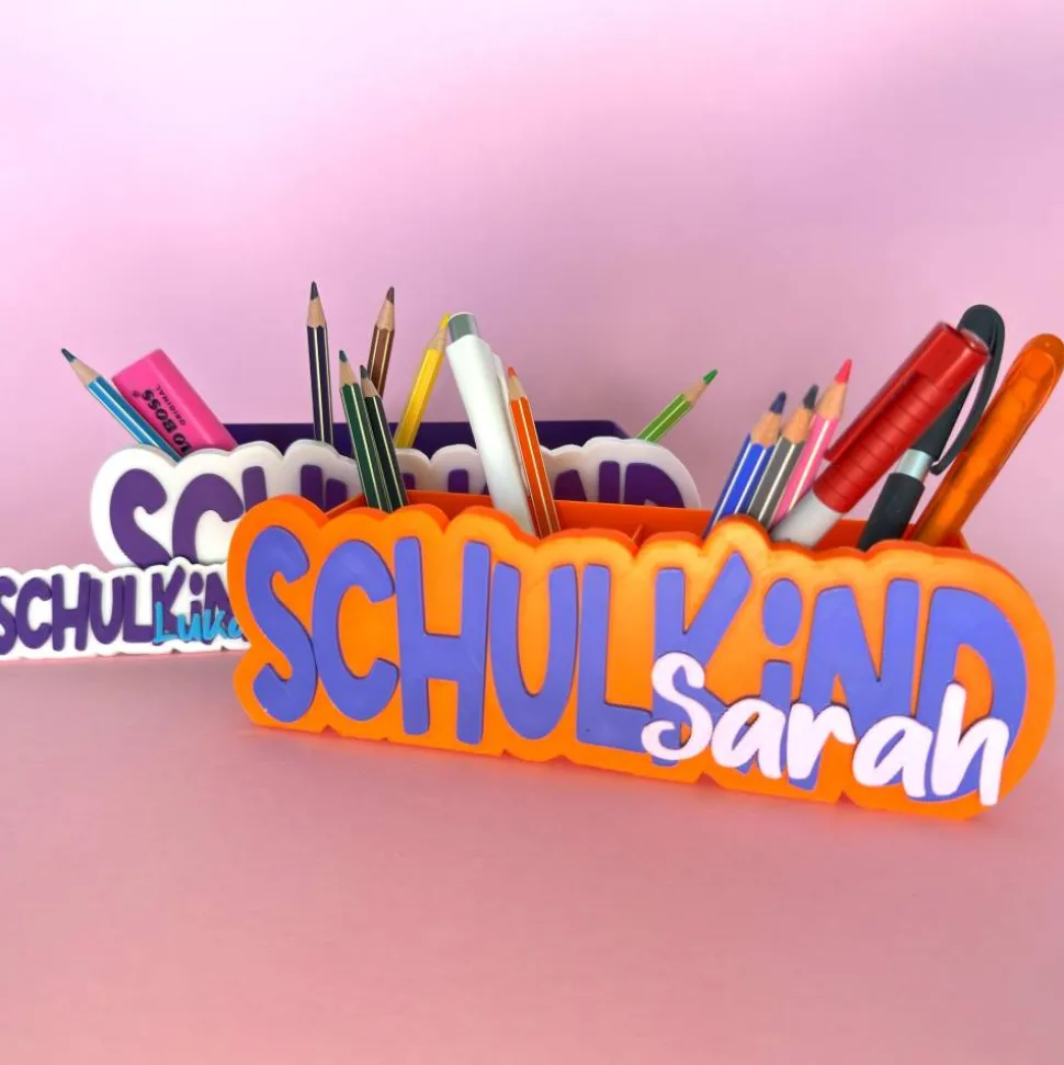 Mit dem personalisierten Schreibtischorganizer im SCHULKiND-Design sorgst du für eine tolle Überraschung zum Schulstart! Der farbige Stiftehalter mit Name ist perfekt für die Schultüte und bringt Ordnung und Freude auf jeden Kinderschreibtisch.