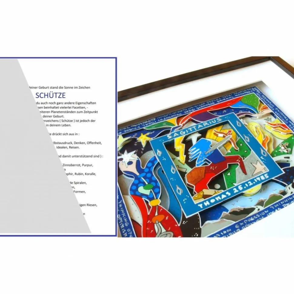Diese 3D-Sternzeichenbilder werden im Bild beschriftet mit Ihrem Namen und Geburtsdatum. Sie sind daher ein ganz persönliches Geschenk, – für einen lieben Freund, Verwandten oder einfach für Sie selbst. Alle Sternzeichen-Bilder sind gerahmt ( Ready To Hang ). Auf der Rückseite der Rahmung : alle wichtigen Erläuterungen zu der Energie dieses Zeichens.