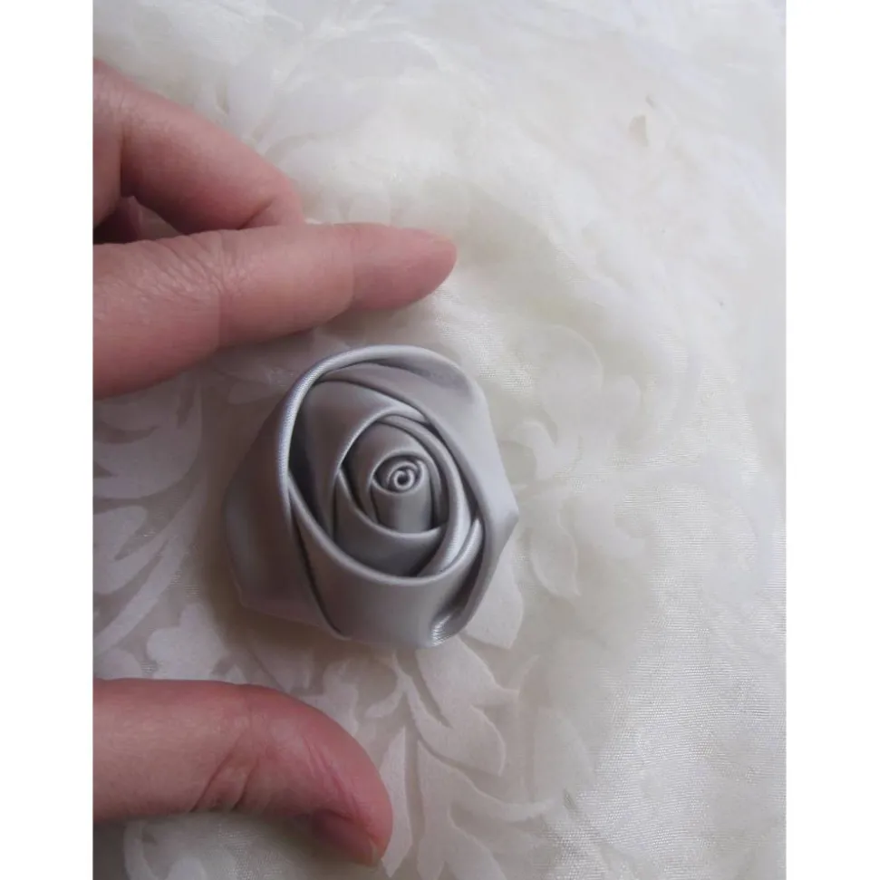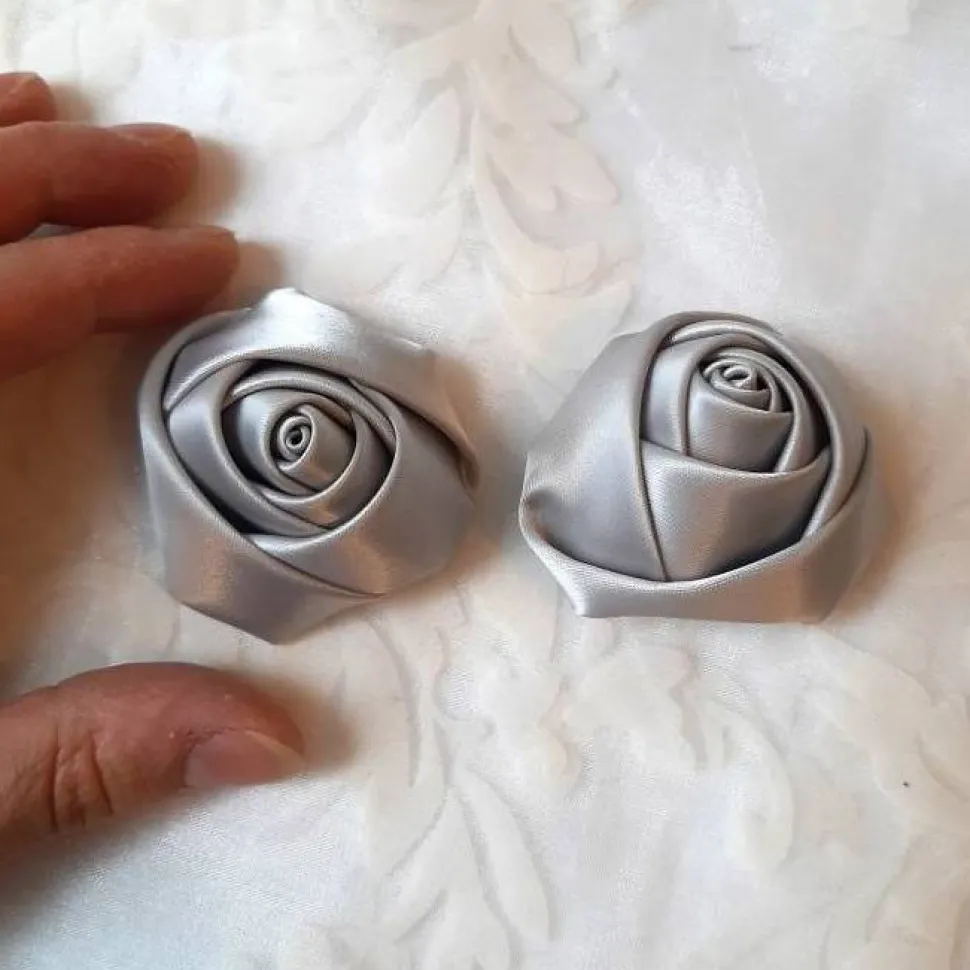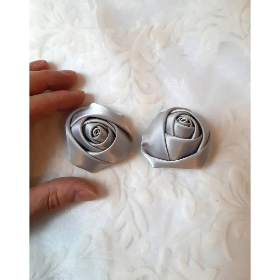 Zwei elegante Schuhclips in Form von Blüten aus hellgrauem, schimmerndem Satin.