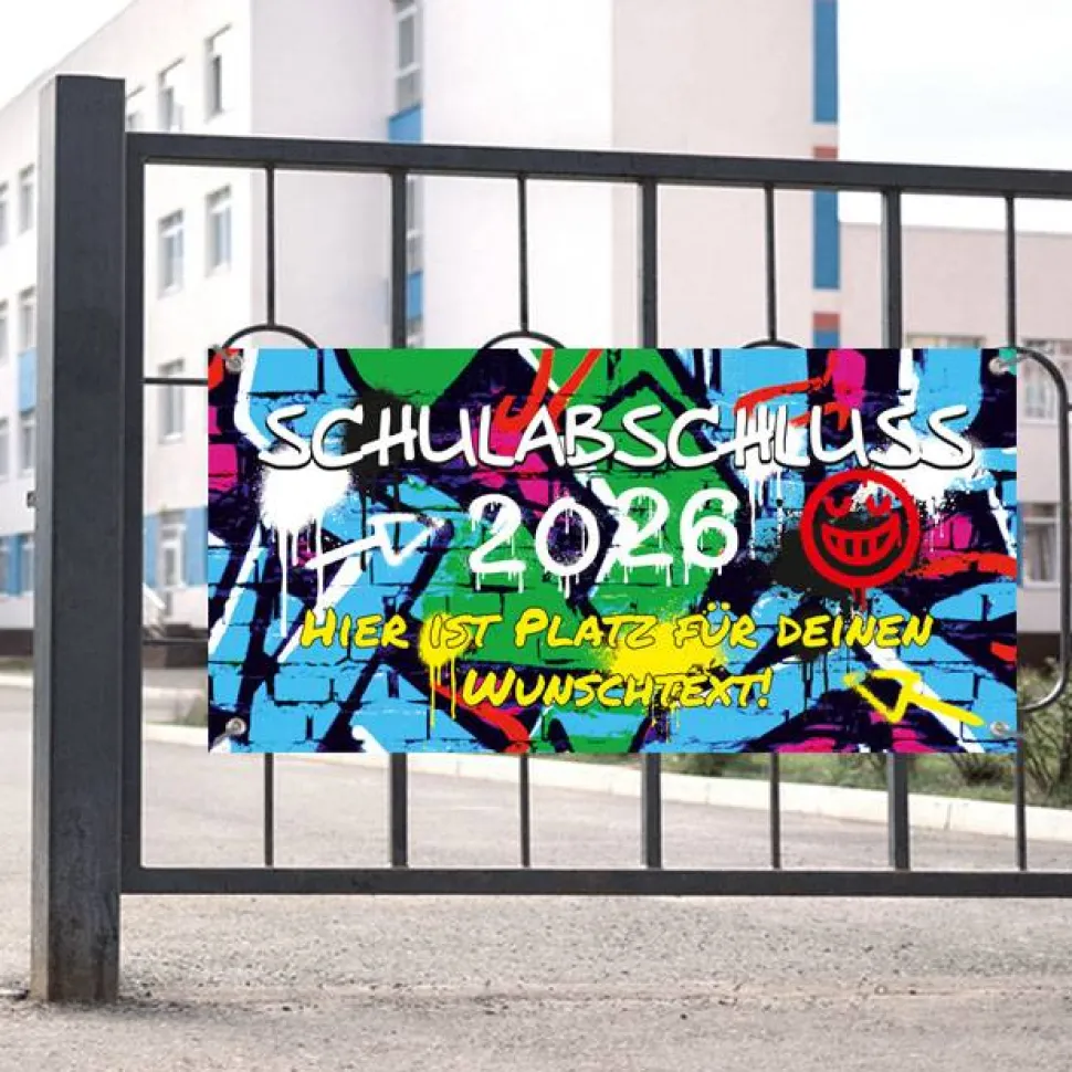 Feiere deinen ABI Abschluss mit einem einzigartigen und nachhaltigen Banner! Dieses personaliserbare Banner im Graffiti-Look ist ein echter Hingucker für jeden Schulabschluss und bietet dir die Möglichkeit, deinen ganz individuellen Wunschtext zu gestalten. Wähle aus drei umweltfreundlichen Materialien und setze ein Zeichen für Nachhaltigkeit!