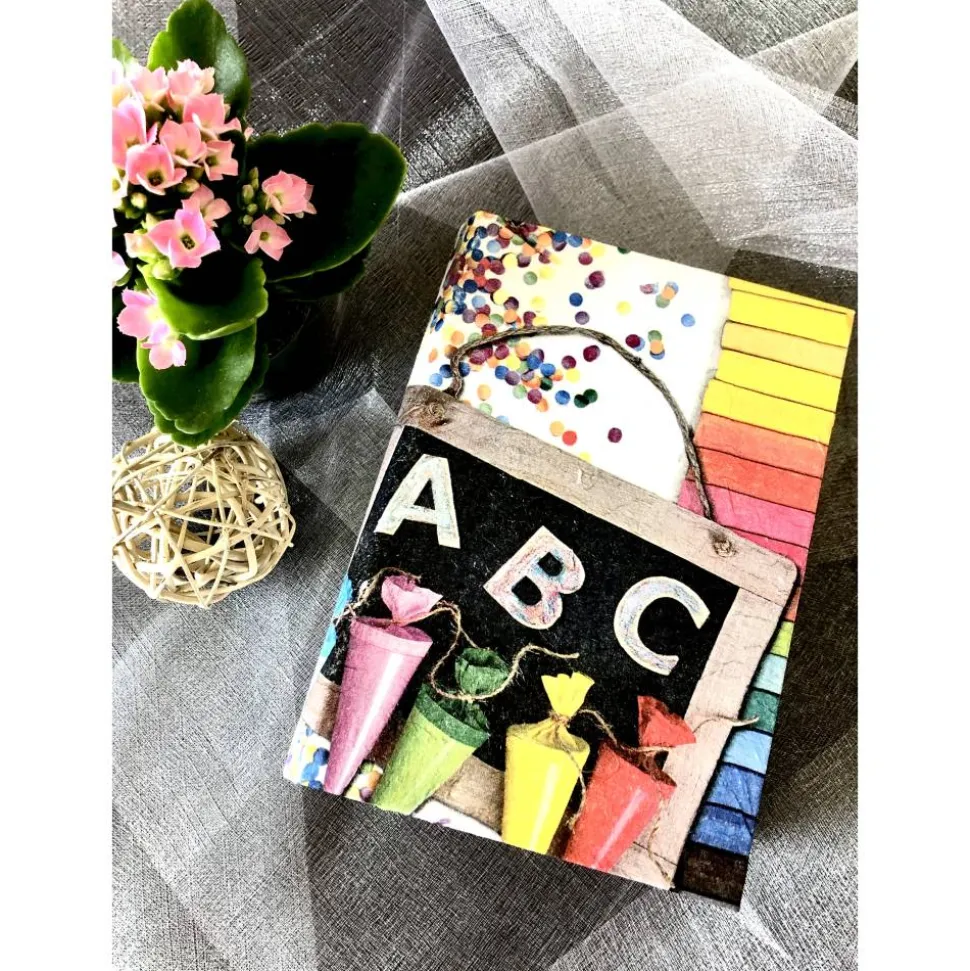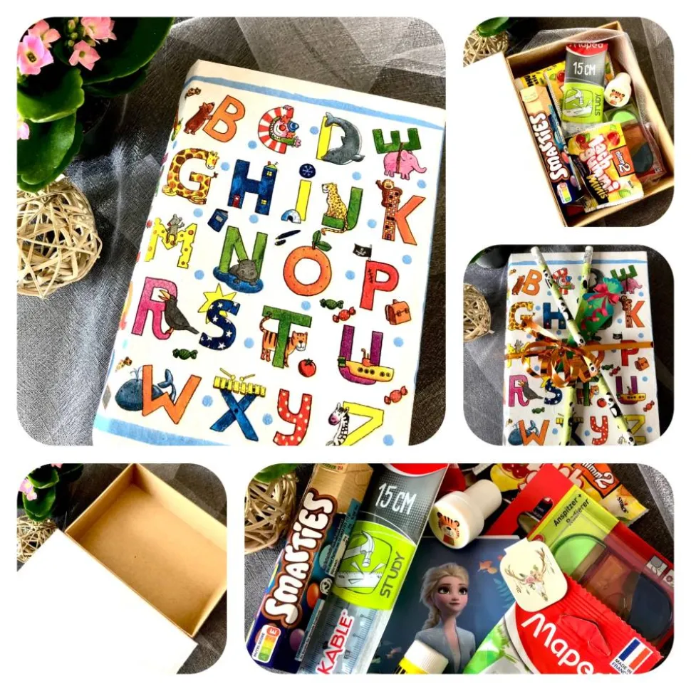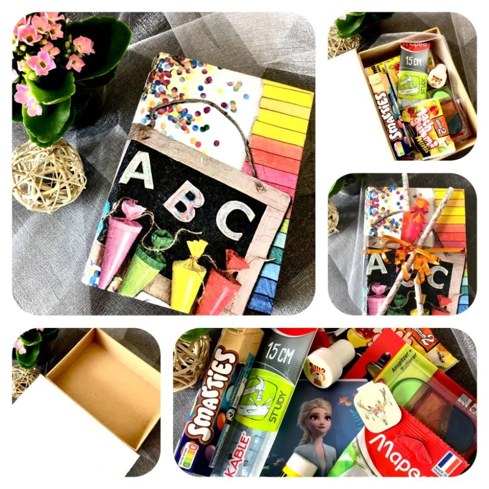 Ich habe viele nützliche Sachen für die Schulanfänger reingepackt und speziell verziert mit Hilfe der Serviettentechnik.