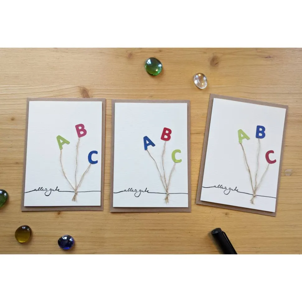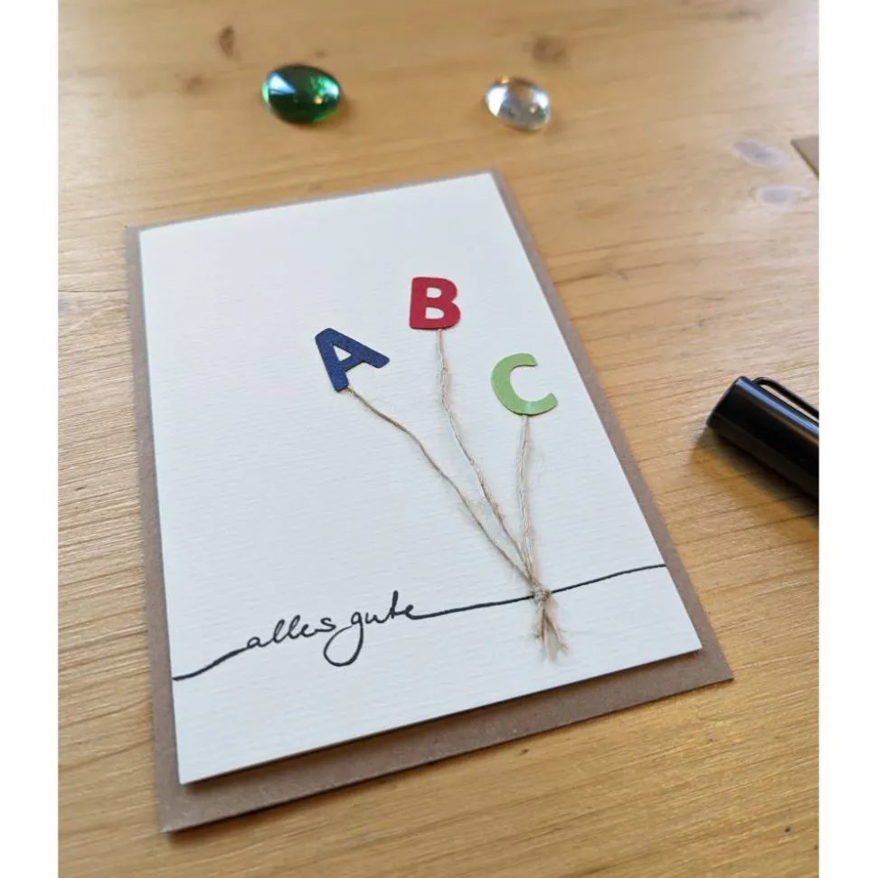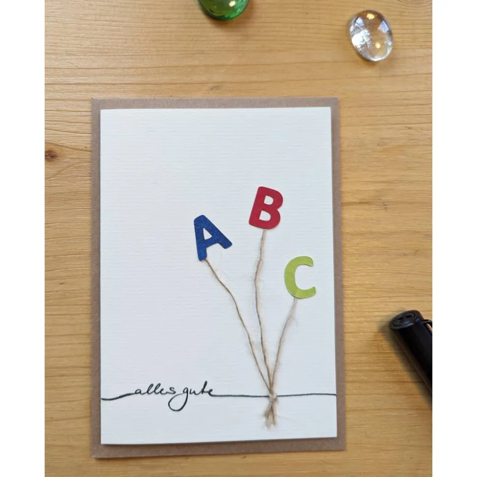 Jede Karte ist mit viel Liebe handgefertigt und unterscheidet sich leicht, u.a. in der Farbe und Position der Buchstaben. Die Auswahl erfolgt zufällig, Sie können aber ihre Wünsche für die Fähnchenfarben per Nachricht an mich senden.