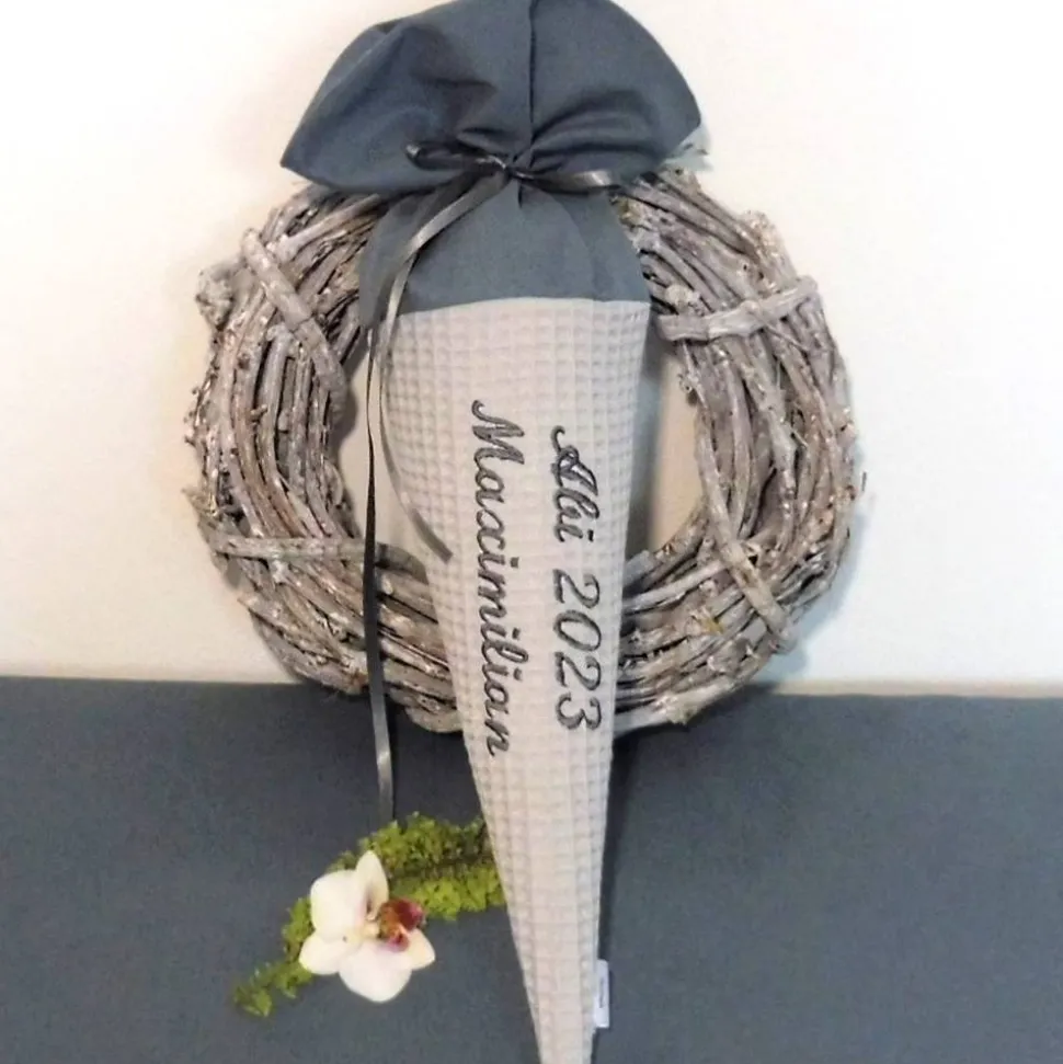 Durch die individuelle Bestickung wird die Schultüte zu einem absoluten Unikat. Bei einem kurzen Namen kann ich gerne die Variante auf der grünen Schultüte verwenden, bei einem längeren Namen sticke ich wie auf der grauen Tüte abgebildet.