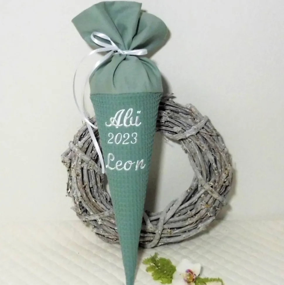 Durch die individuelle Bestickung wird die Schultüte zu einem absoluten Unikat. Bei einem kurzen Namen verwende ich die Variante auf der grünen Schultüte, bei einem längeren Namen sticke ich wie auf der grauen Tüte abgebildet.
