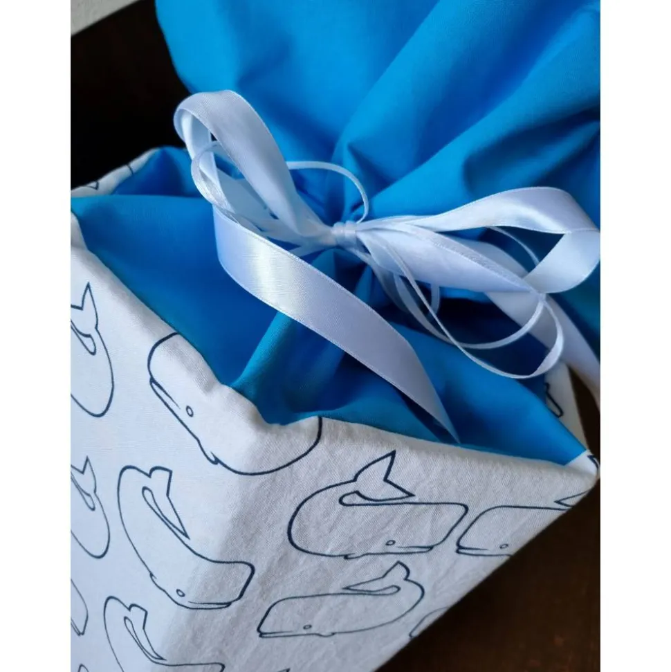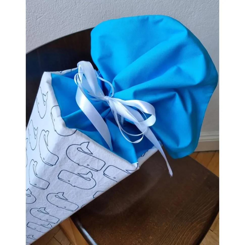 Die Schultüte ist aus Baumwolle mit Wal-Print genäht und eignet sich für 85cm Papprohlinge. Sie hat etwas Spiel, sodass sie sowohl für eckige, als auch runde Rohlinge genutzt werden kann.