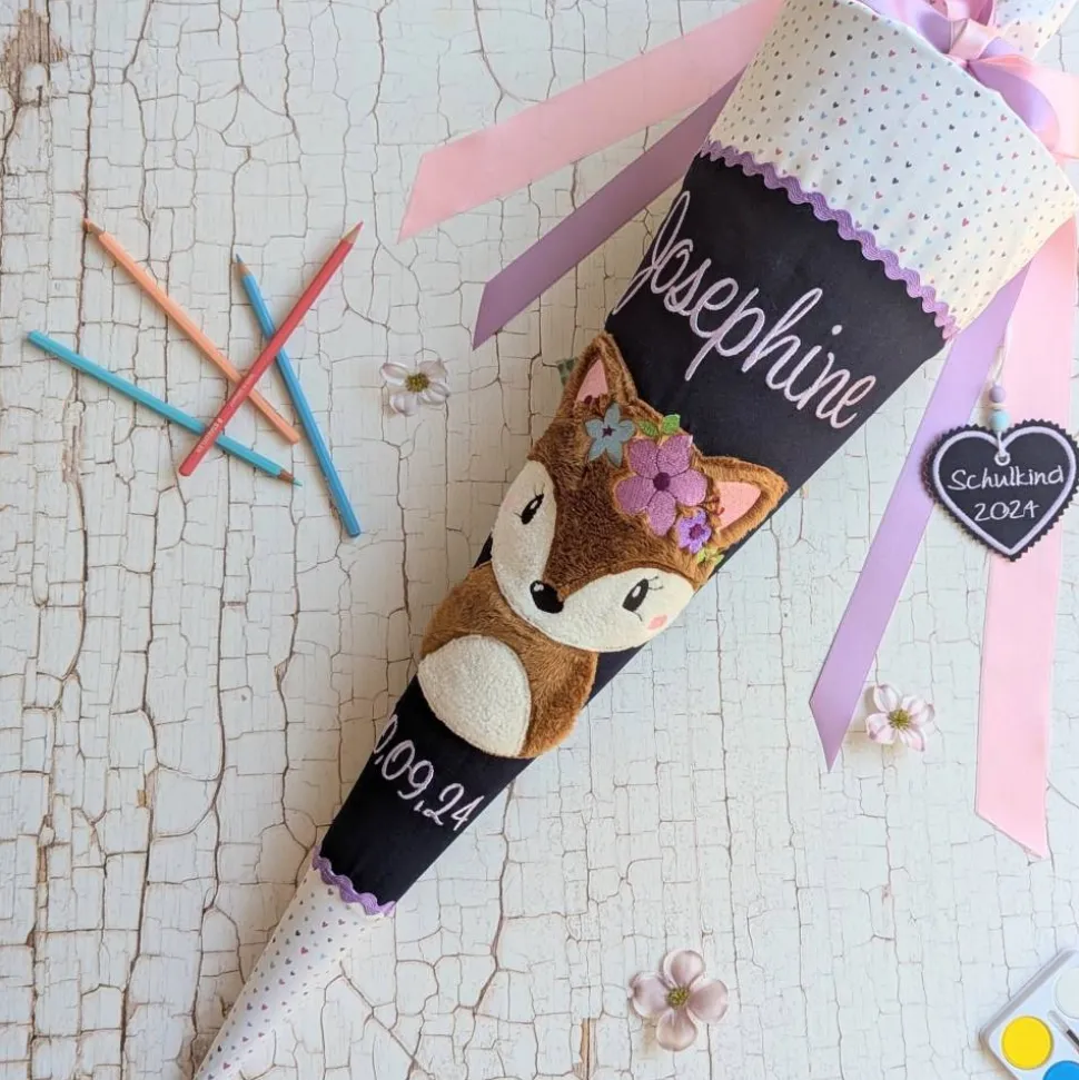 Entdecke die zauberhafte Schultüte aus Stoff mit liebevoll aufgesticktem Fuchs, die perfekt zum Schulanfang deines Kindes passt! Diese einzigartige Zuckertüte wird aus hochwertigen Stoffen und mit viel Liebe zum Detail handgefertigt. Jeder Name und das süße Fuchsmotiv werden individuell nach der Bestellung aufgestickt – so hältst du ein echtes Unikat in den Händen.