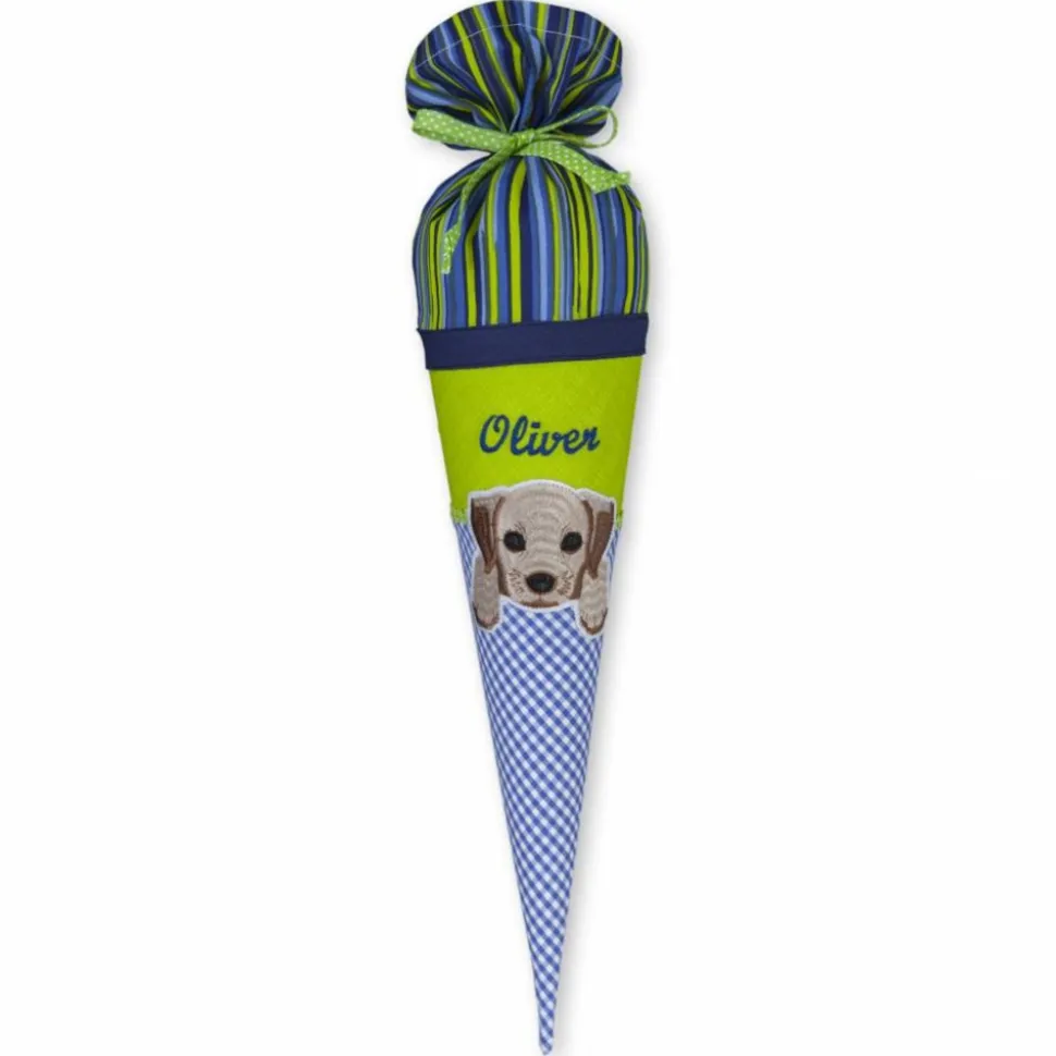 Handgefertigte Schultüte aus Stoff für Geschwister. Farblich passend zu der großen Stoffschultüte gestaltet. Mit Hund. Farblich kombiniert in Grün – Blau.