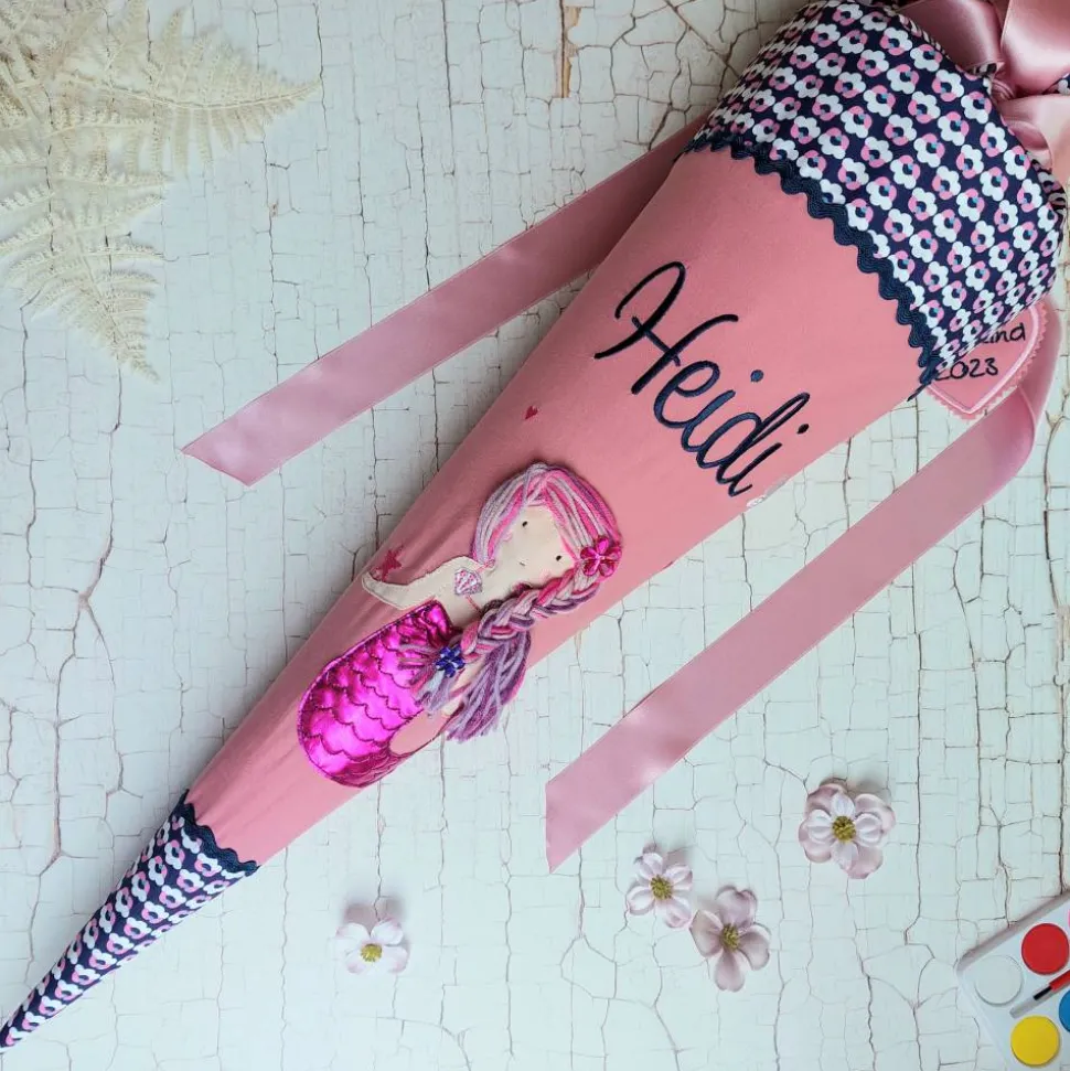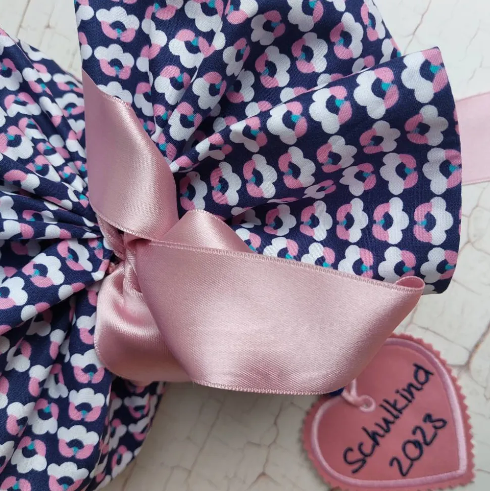 Das Motiv und der Name werden nach der Bestellung aufgestickt. Die Größe des Namens kann durch die Anzahl der Buchstaben variieren. Lange Namen werden also etwas kleiner. Das gleiche gilt für Doppelnamen (Aufpreis). Bitte geben Sie hier an, ob die Namen nebeneinander oder untereinander aufgestickt werden sollen. Auf Wunsch kann auch das Einschulungsdatum aufgestickt werden (Aufpreis). Den abgebildeten Herzanhänger (Aufpreis) fertige ich passend aus den Stoffen der Schultüte an.