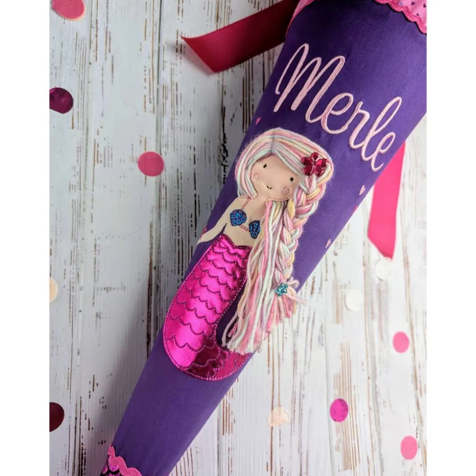 Die zauberhafte Schultüte mit aufgestickter Meerjungfrau und Flosse ist ein echter Blickfang und wird exklusiv für dich aus hochwertigen, nach Ökotex-Standard 100 zertifizierten Baumwollstoffen gefertigt. Jeder Name wird individuell aufgestickt und macht die Zuckertüte zu einem ganz persönlichen Unikat. Auch das Einschulungsdatum kann gegen Aufpreis hinzugefügt werden. Wähle, ob der Name nebeneinander oder untereinander erscheinen soll!