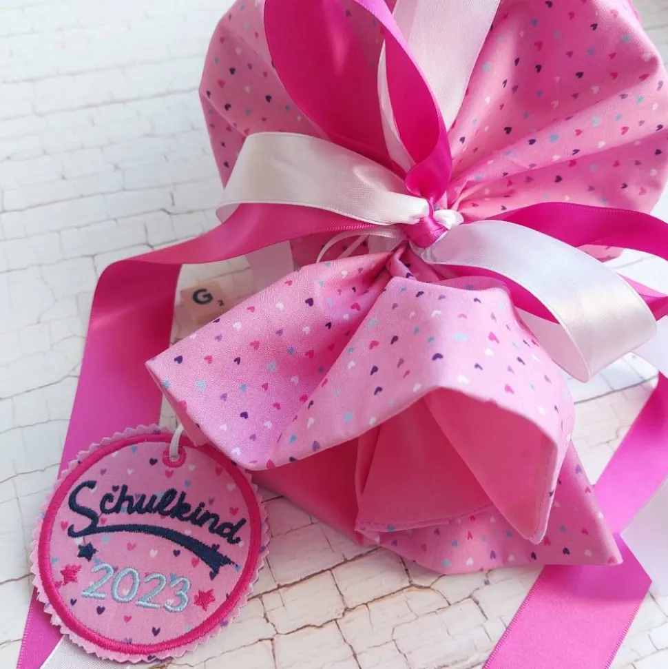 Das Motiv und der Name werden nach der Bestellung aufgestickt. Die Größe des Namens kann durch die Anzahl der Buchstaben variieren. Lange Namen werden also etwas kleiner. Das gleiche gilt für Doppelnamen (Aufpreis). Bitte geben Sie hier an, ob die Namen nebeneinander oder untereinander aufgestickt werden sollen. Auf Wunsch kann auch das Einschulungsdatum aufgestickt werden (Aufpreis). Den abgebildeten Herzanhänger (Aufpreis) fertige ich passend aus den Stoffen der Schultüte an.