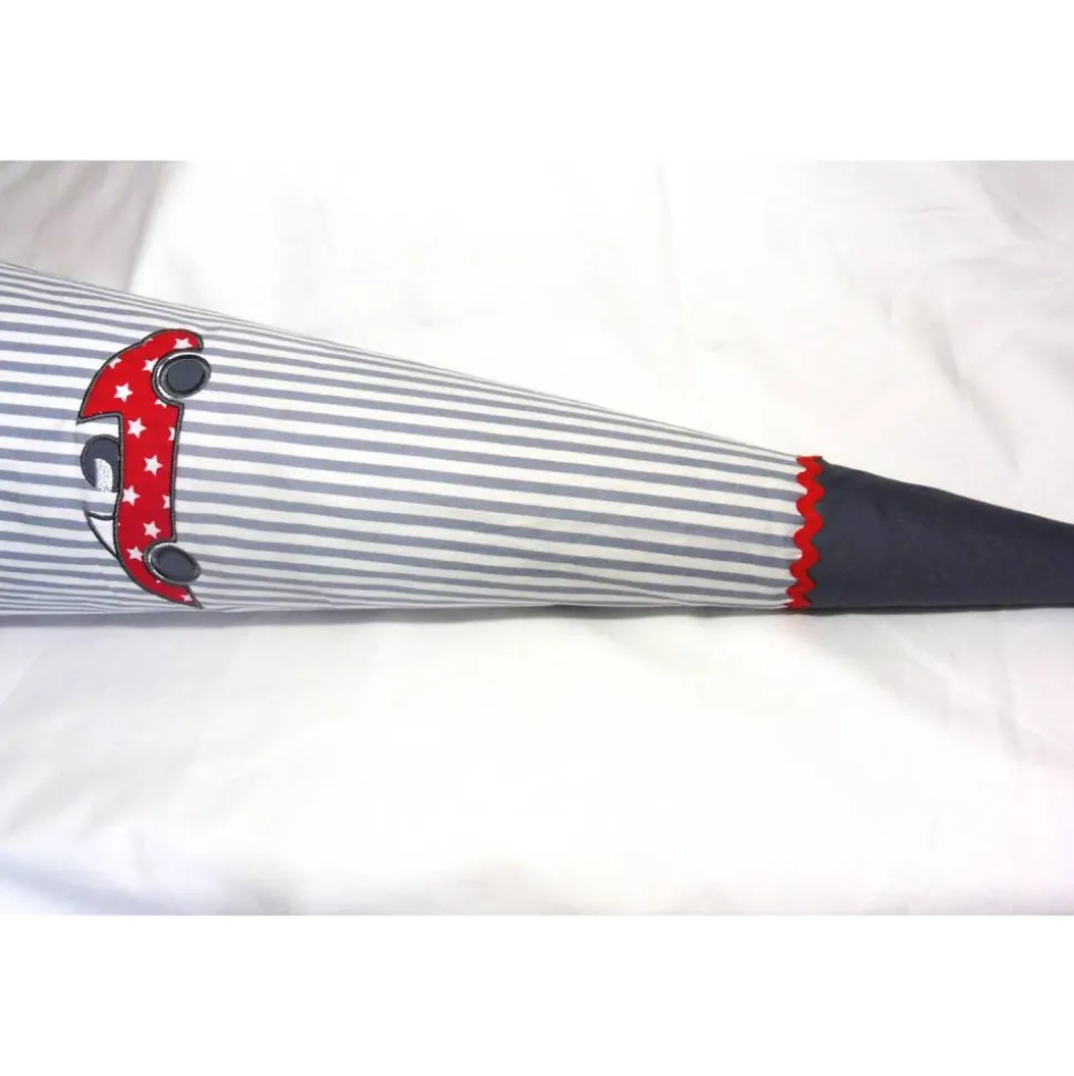Auf die Schultüte können der Name und – falls gewünscht – auch ein Datum gestickt werden (wahlweise in rot oder dunkelgrau).