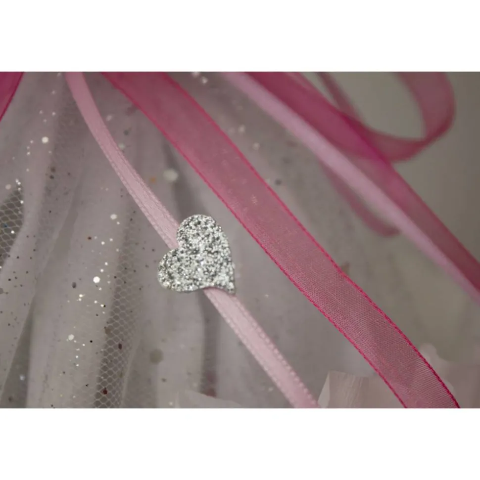 Der Schultütenrohling ist mit einem rosafarbenen Herzmotivkarton um klebt. Die Spitze und die Ornamente am Manschettenrand sind aus einem leicht glänzenden, weißen Strukturkarton abgesetzt. Die Manschette besteht aus zwei Lagen. Ein besonderer Hingucker ist der weiße Tüll, mit silberfarbenen Glitzerpartikeln, der das weiße Krepppapier überdeckt. Verschlossen wird die Manschette mit einem rosa Satinband und pinkfarbenem Organzaband. Für einen sauberen Übergang sorgt eine weiße Bordüre, eine pinkfarbenen Holzspitze bildet den Abschluss. Eine Verzierung mit silberfarbenen Glitzerherzen und rosa Schmucksteinen runden den oberen Teil ab.