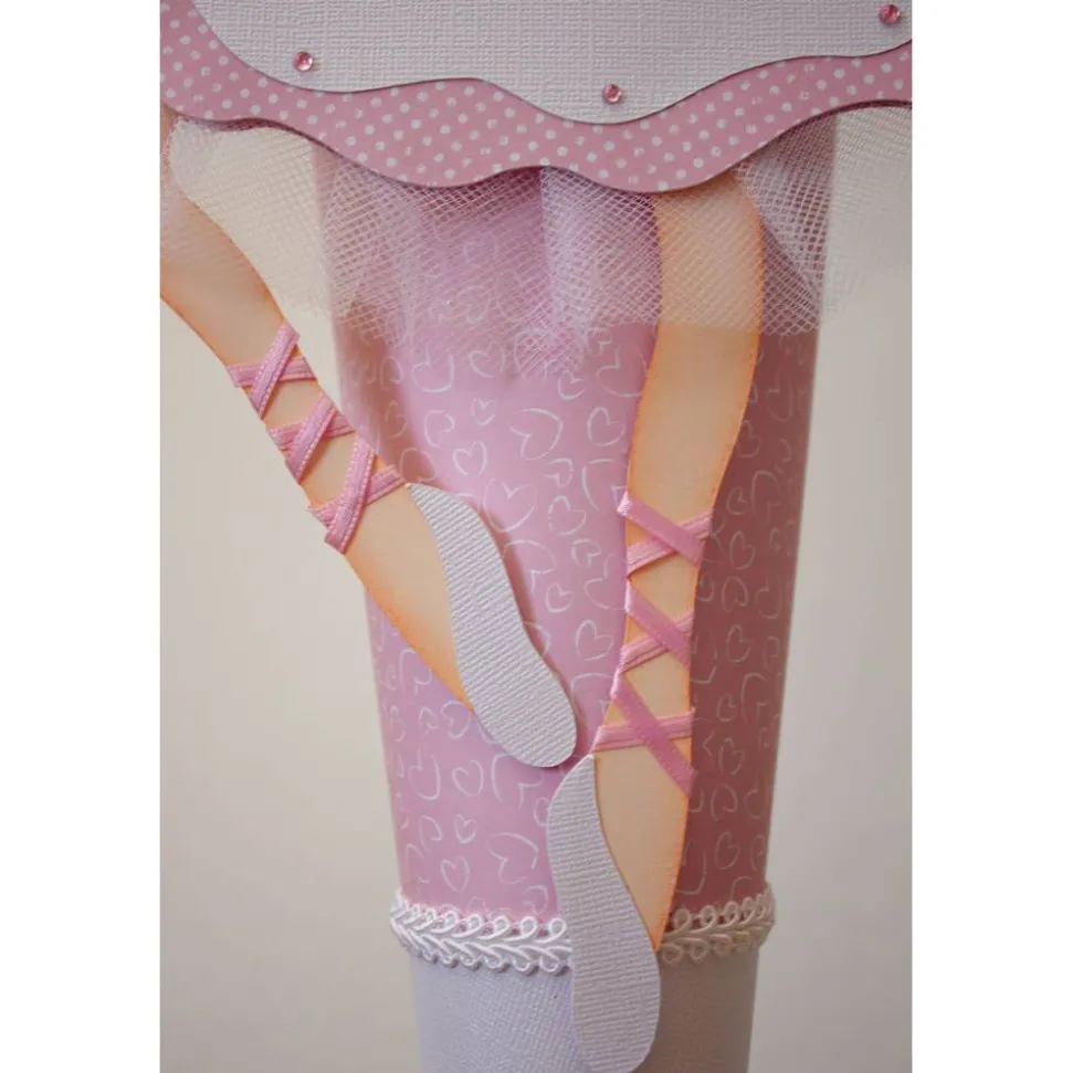 „Mias“ Kleid ist passend zum Schultütenrohling gefertigt. Weißer Tüll unter dem Rock, rosa Schmucksteine und zarte Schleifen setzten zusätzliche Akzente. Das harmonische Gesamtbild wird von ihren Ballettschuhen, die von rosa Satinband gehalten werden, abgerundet.