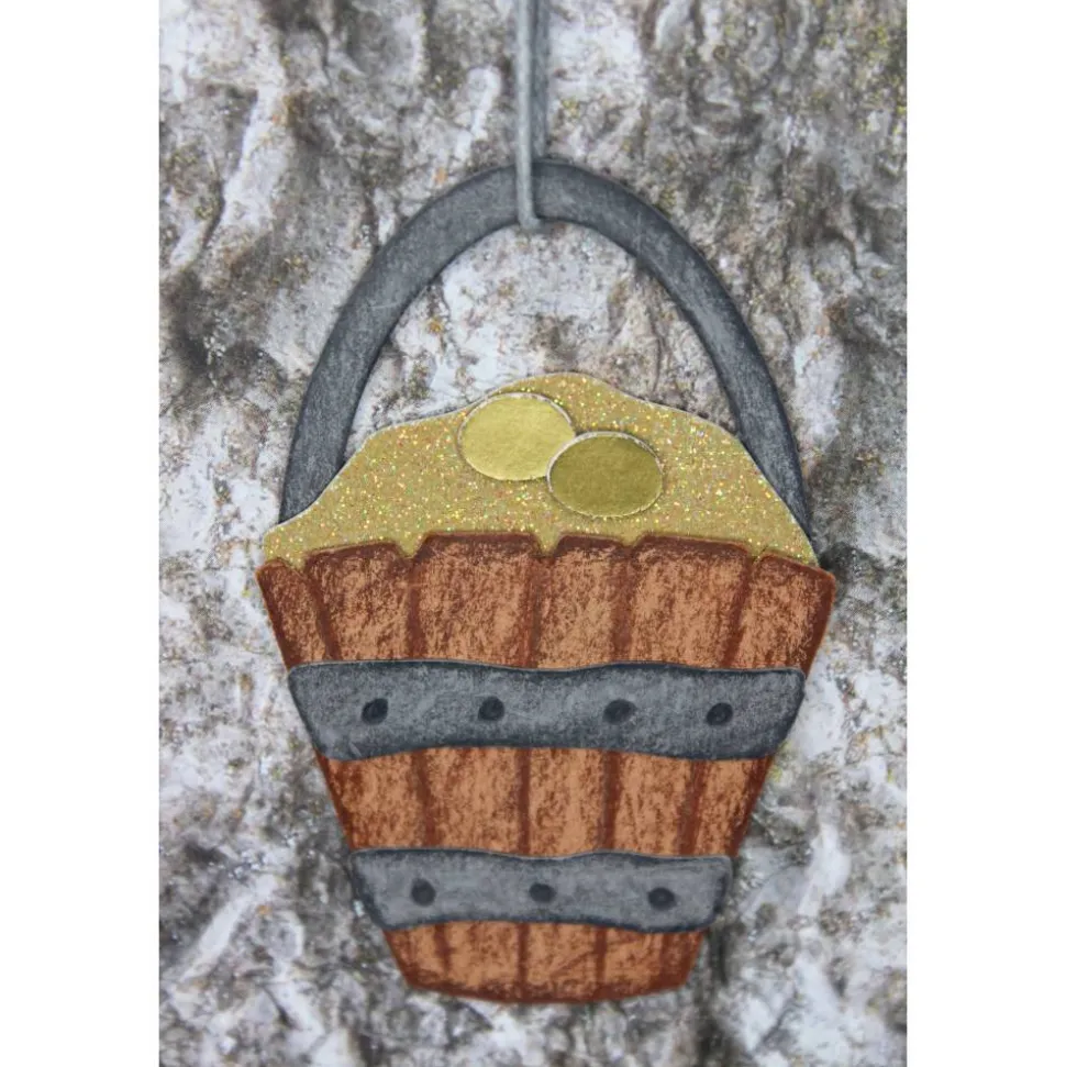 Rund um den Rohling finden sich, mit Gold befüllte Eimer und Bergkristalle wieder.