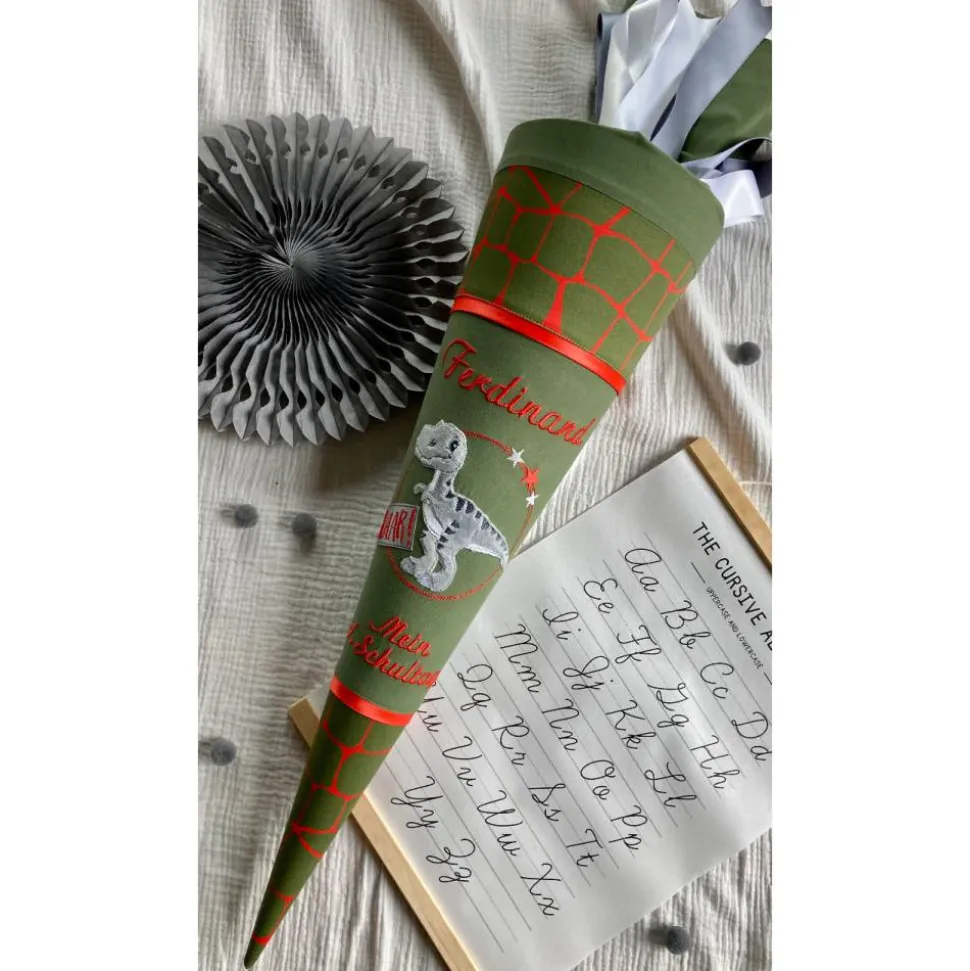 Schultüte Dino für Jungen, passend zum Schulranzen ergobag FeuerspeiBär, T-Rex, mit Namen und Datum, 70 cm der 85 cm