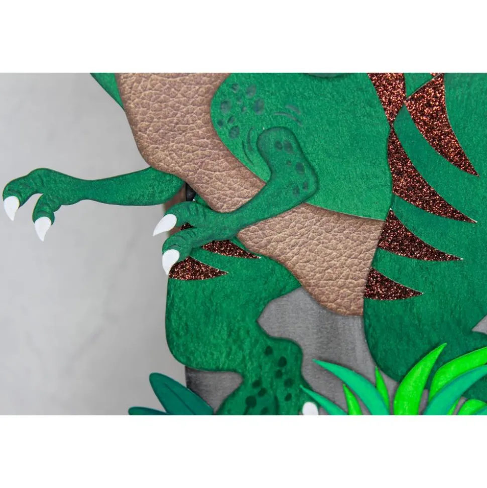 Der Dinosaurier „T-Rex“ ist wahlweise aus braunem oder grünem Fotokarton gearbeitet, einzelne Elemente aus Karton in Lederoptik und braunem Glitterkarton setzen zusätzliche Highlights.