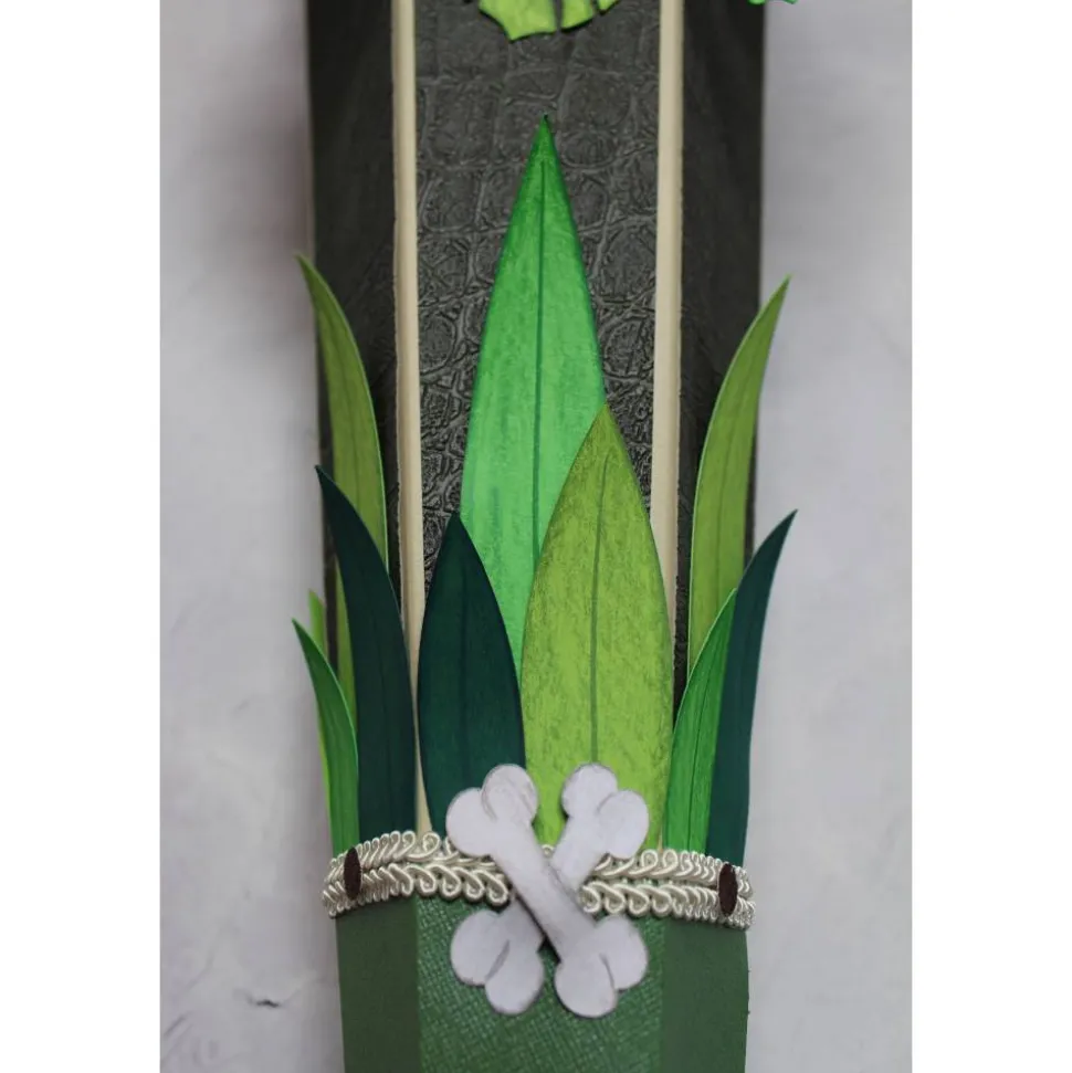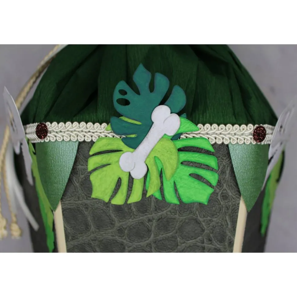 Der Dinosaurierkopf „T-Rex“ ist aus braunem Fotokarton gearbeitet, einzelne Elemente aus braunem Glitterkarton setzen zusätzliche Highlights, er bildet das Hauptmotiv auf der Schultüte. Mehrlagig gearbeitete Elemente verleihen dem Motiv zusätzliche Tiefe, Stabilität und eine schöne 3D-Optik. Zahlreiche tropische Blätter, Knochen und Skelettköpfe schmücken den Schultütenrohling und schaffen ein harmonisches, lebendiges Gesamtbild.
