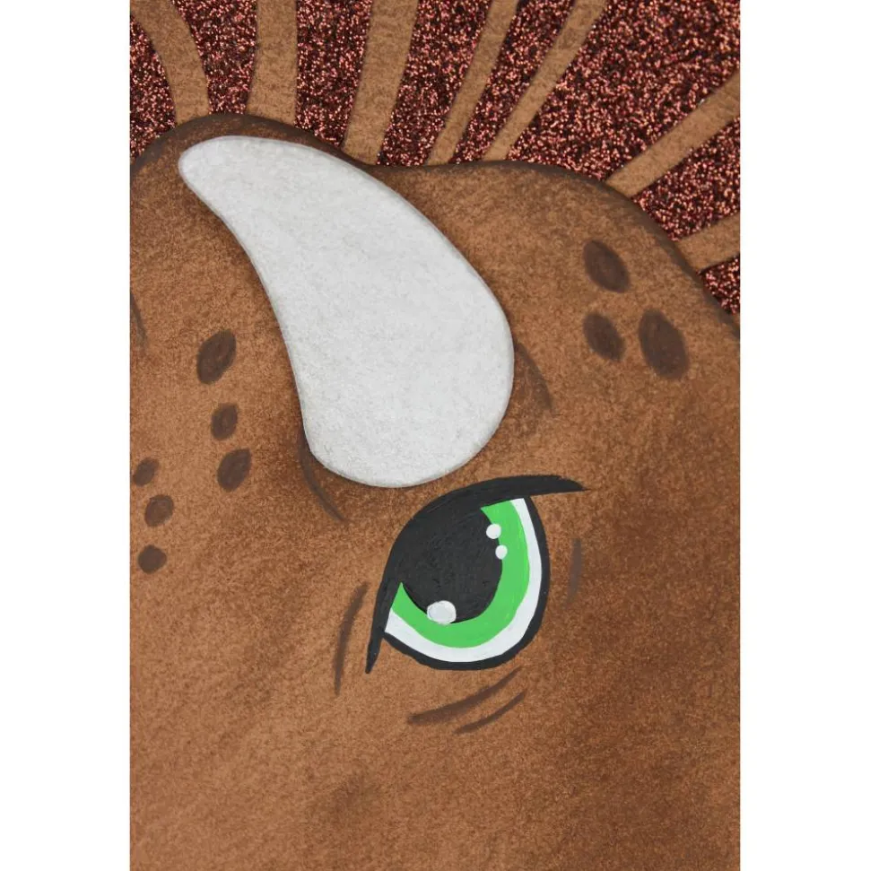 Der Dinosaurierkopf „Zera“ ist aus braunem und beigen Fotokarton gearbeitet, einzelne Elemente aus braunem Glitterkarton setzen zusätzliche Highlights, er bildet das Hauptmotiv auf der Schultüte.