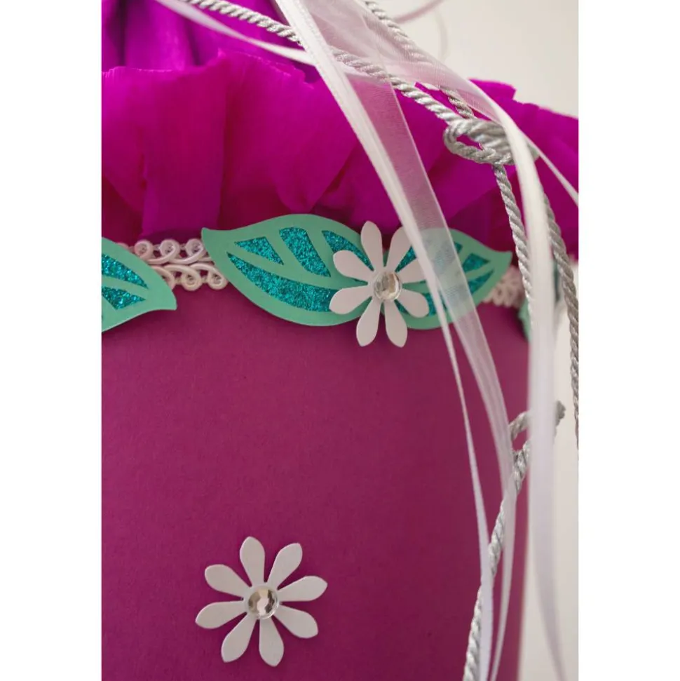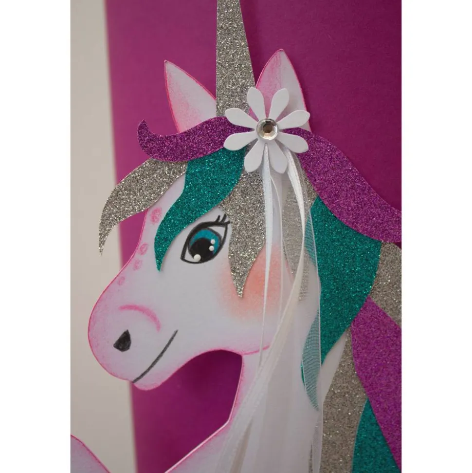 „Luna“ ist aus weißem Fotokarton, doppelt gefertigt. Die Mähne und der Schweif sind aus silber, pink und petrolfarbenem Glitterkarton hergestellt und spiegelt sich in den Hufen und dem Horn wieder. Die Schleifen, mit ihren zarten Blüten und Blütenblättern an Kopf und Schweif, runden das harmonische Gesamtbild ab.