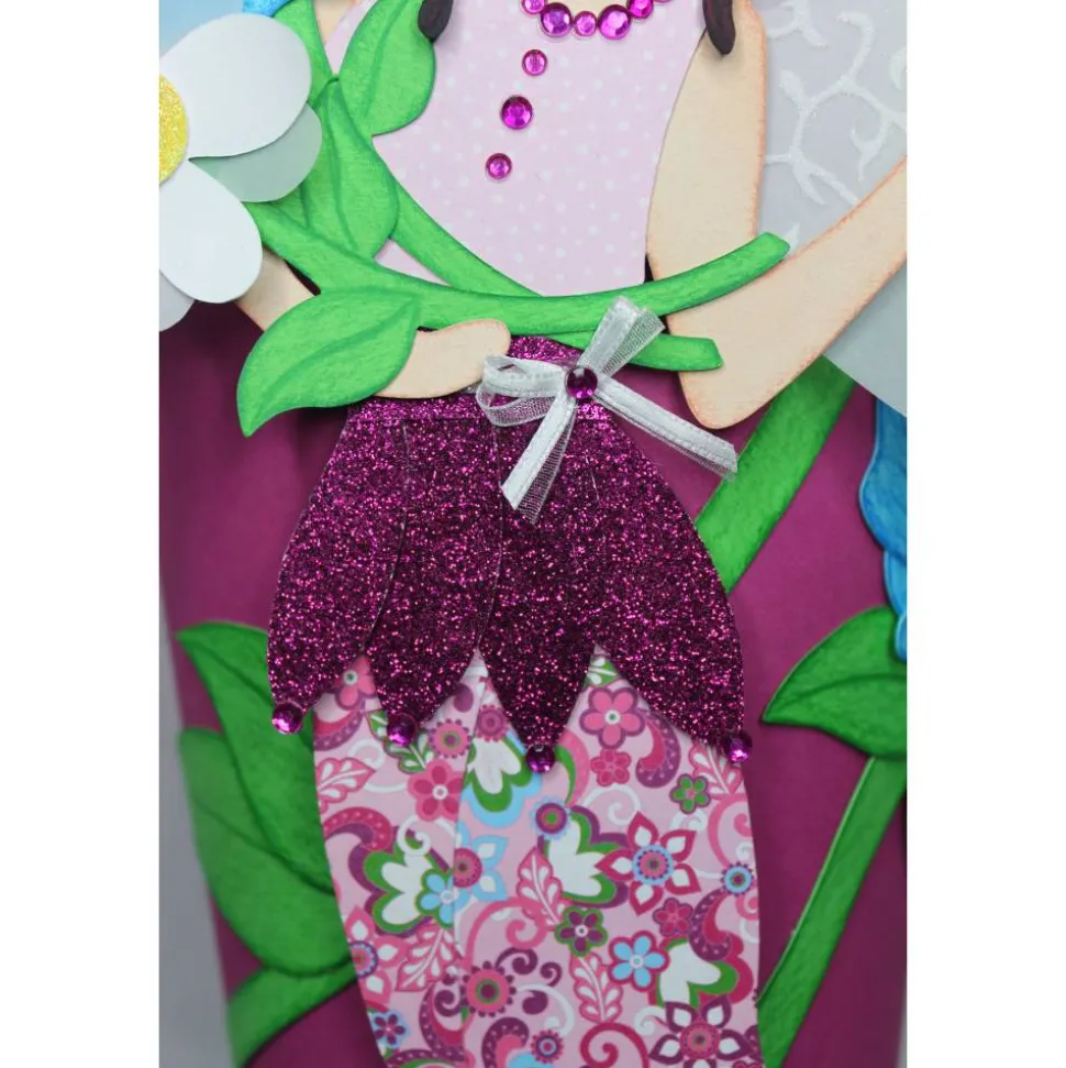 Die bezaubernde „Flora“ schwebt zwischen bunten Blumenranken und bildet das Hauptmotiv. Der Körper ist aus Fotokarton, doppelt gefertigt, ihr Kleidchen spiegelt die Motivkartons des Rohlings wider und einzelne Elemente sind aus violettem Glitterkarton gearbeitet.