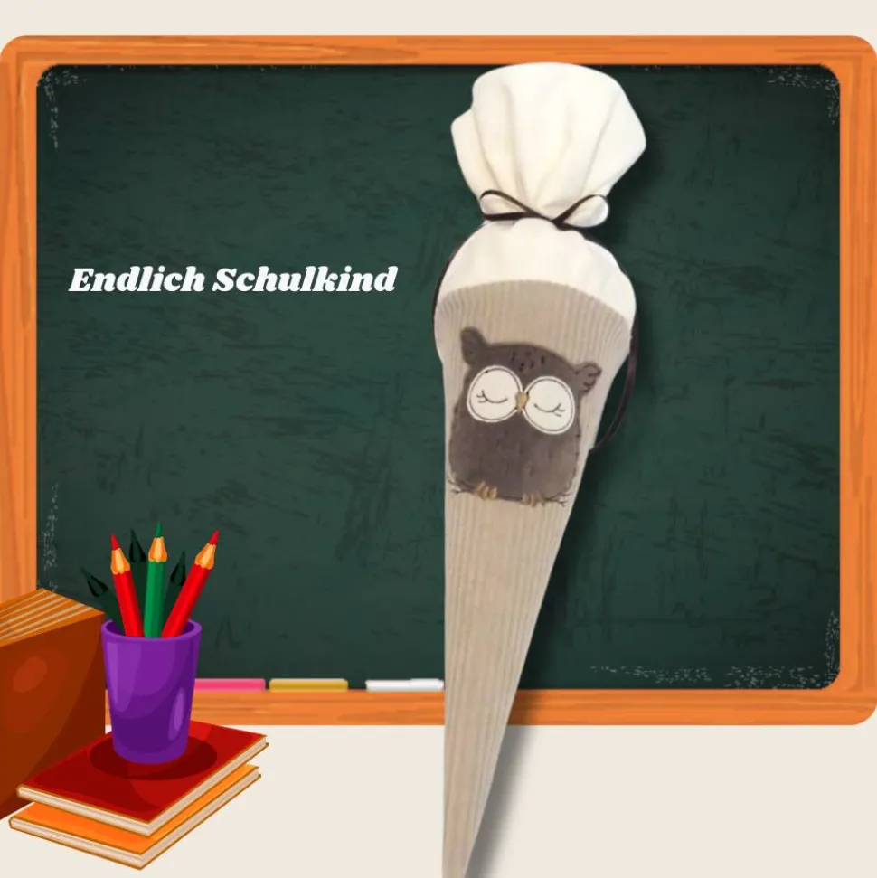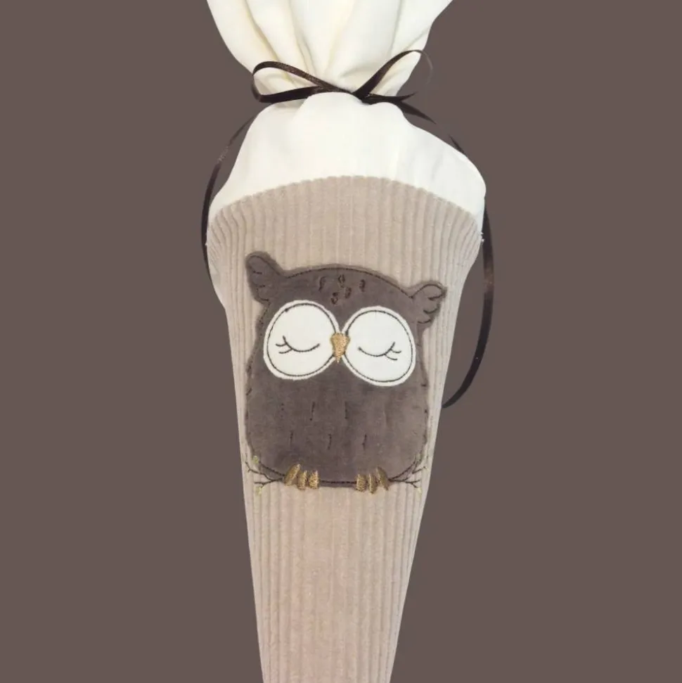 Mach den ersten Schultag oder Kindergartentag zu einem unvergesslichen Erlebnis! Diese liebevoll genähte Schultüte aus hellen, weichen Cordstoffen ist mit einer süßen Eule bestickt, die deinen kleinen Schatz begleitet. Die individuell bestickbare Stofftüte eignet sich perfekt als große Zuckertüte zur Einschulung oder als kleine Geschwistertüte für die KiTa.
