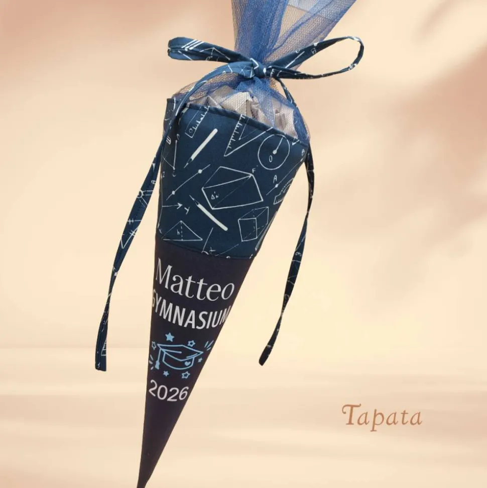 ➡ Namenswunsch: Auf Wunsch kann die Abschlusstüte mit dem Namen des Absolventen versehen werden. Bitte geben Sie in das Feld Personalisierungswünsche den Namen ein. Max. 12 Zeichen (Sonderzeichen nur nach Rücksprache). Je nach Länge wird die Positionierung des Namens und die Größe angepasst.