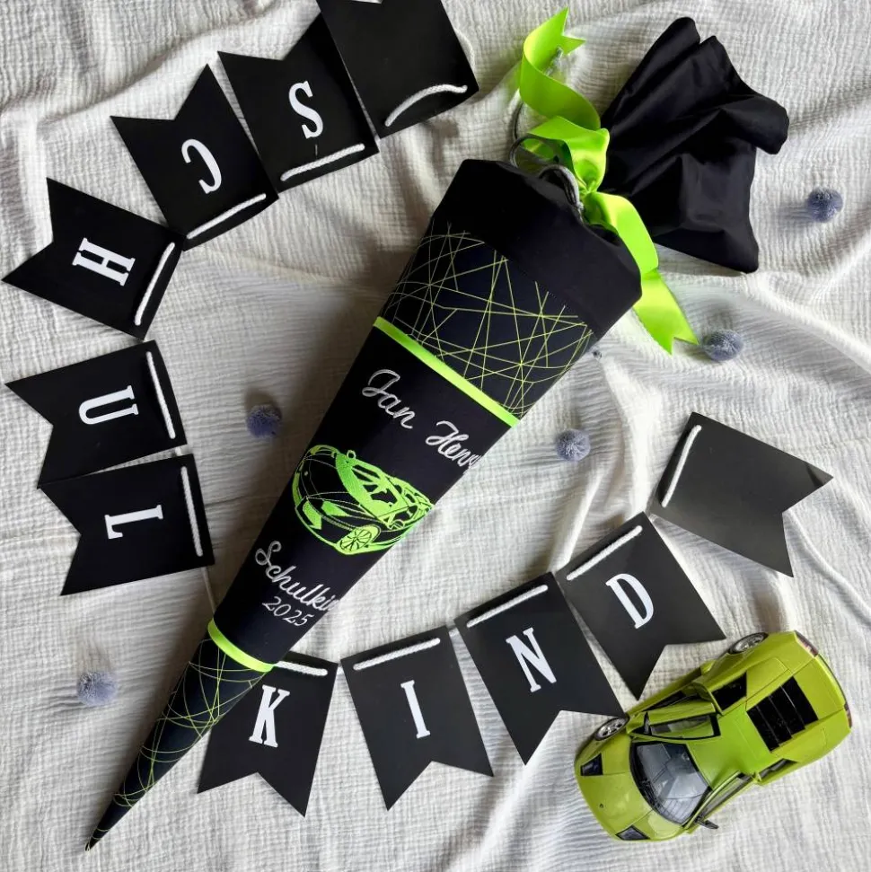 Diese Schultüte mit einem Rennauto ist passend zum ergobag Schulranzen Cybär Race gestaltet. Mit der Größe 70 oder 85 cm ist sie der Klassiker und bietet genügend Platz für Geschenke zum Schulstart. Auf deinen Wunsch kann auch Einschulungsdatum eingestickt werden. Ergänzend dazu kann auch Kissen bestellt werden, das nach den großen Tag des Schulanfängers zum Erinnerungsstück zum Kuscheln umgewandet werden kann.