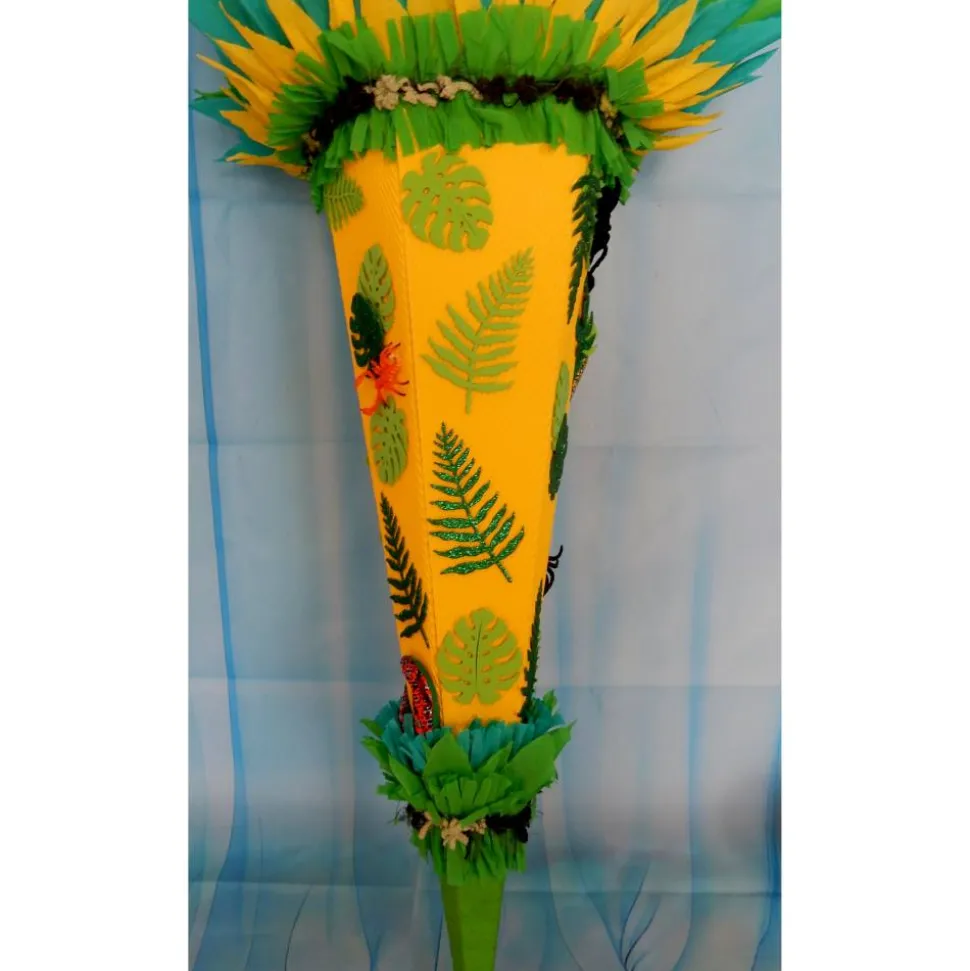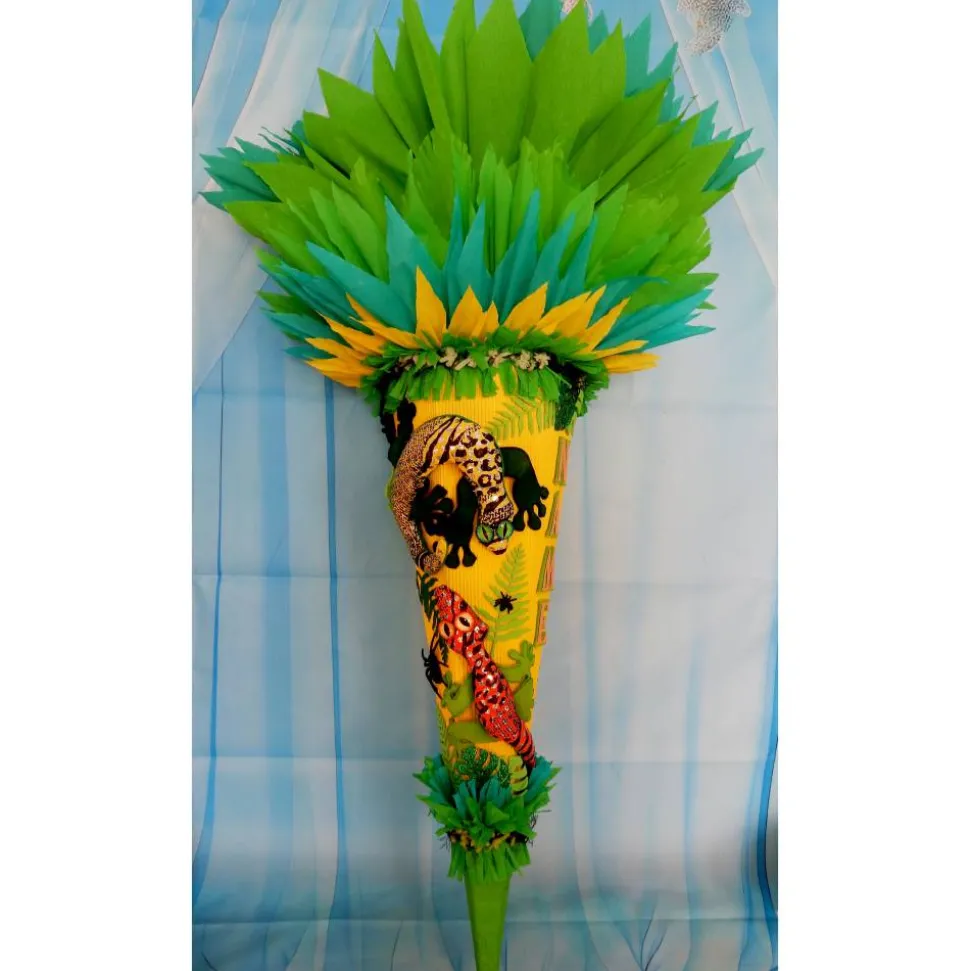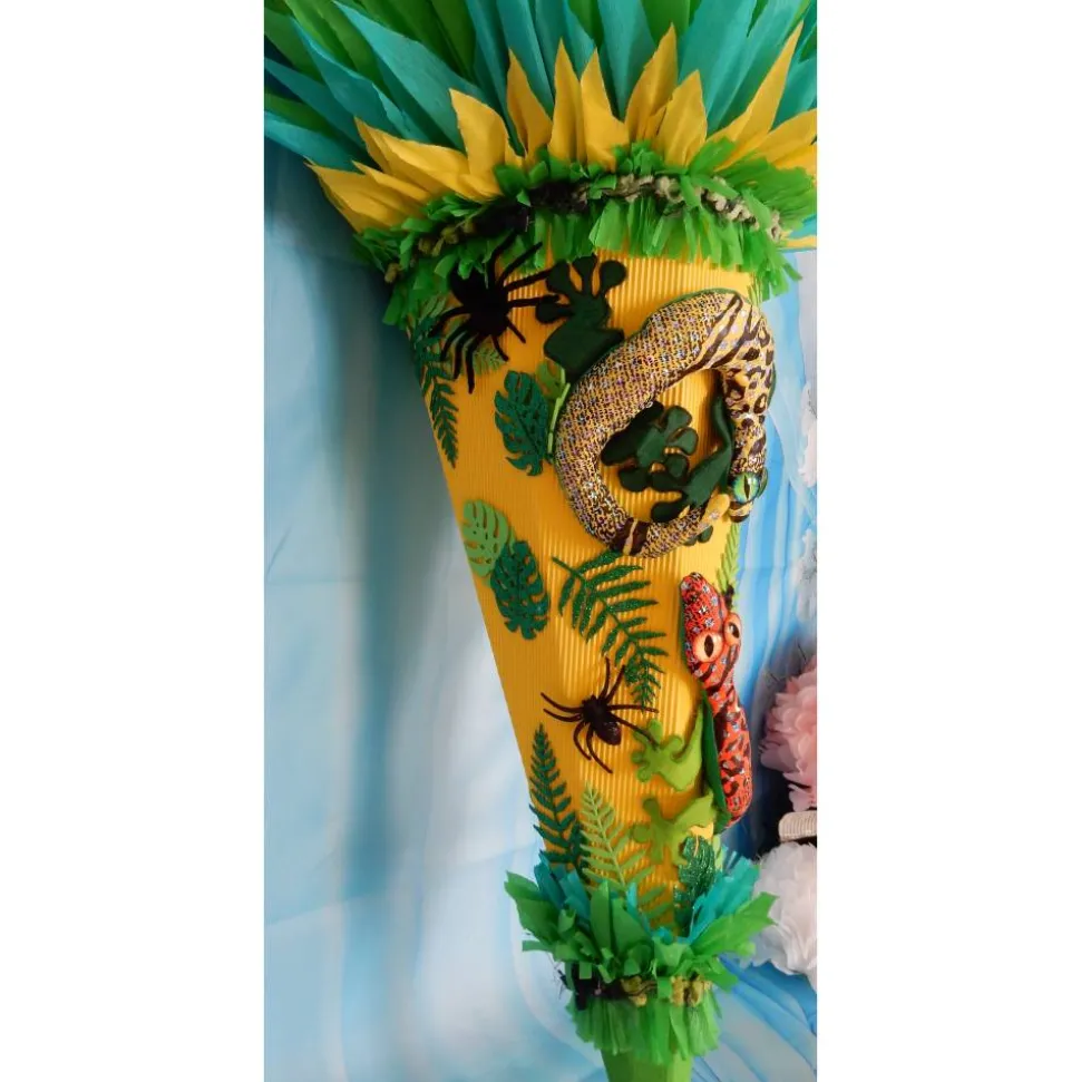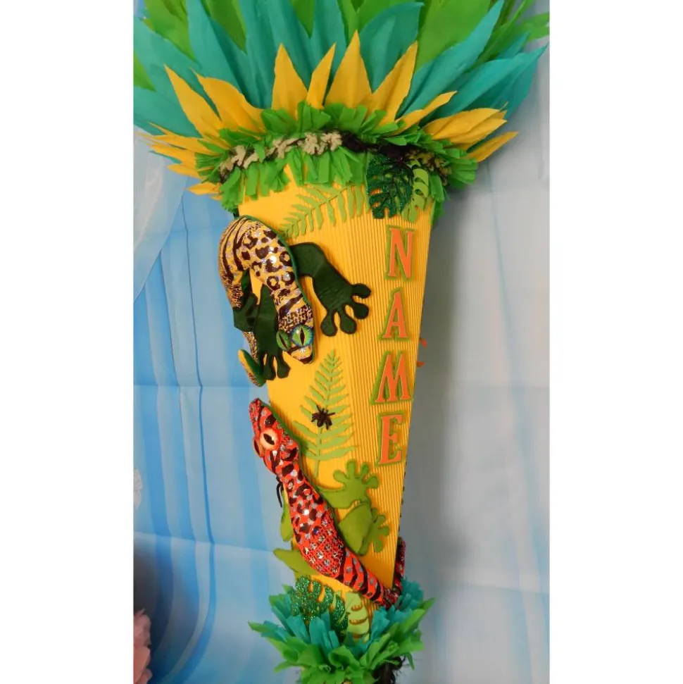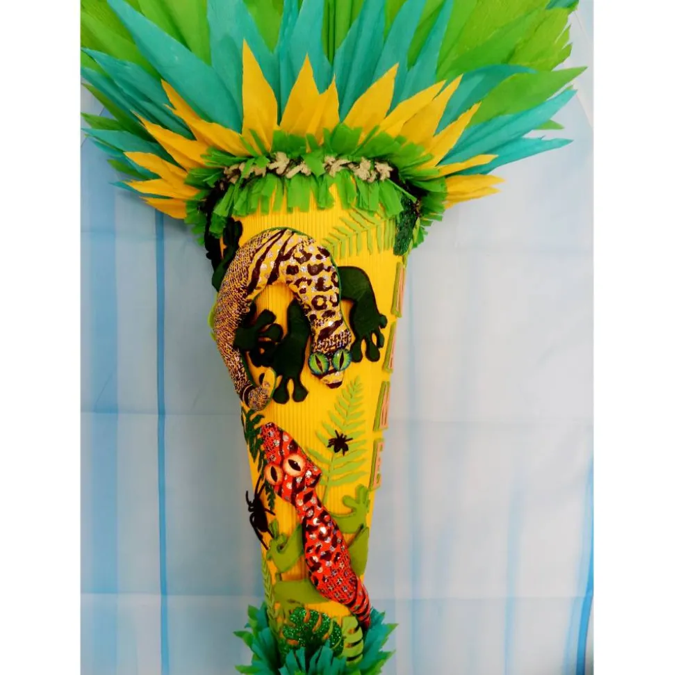 Diese einzigartige Schultüte bringt exotisches Flair in jeden Schulanfang! Mit liebevoll gestalteten Details wie dem kletternden Gecko, tropischen Blättern und einer prächtigen Federkrone in leuchtendem Grün, Türkis und Sonnengelb. Der perfekte Begleiter für kleine Entdecker, die ihren ersten Schultag zu etwas ganz Besonderem machen möchten!