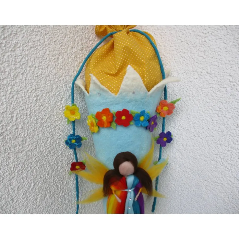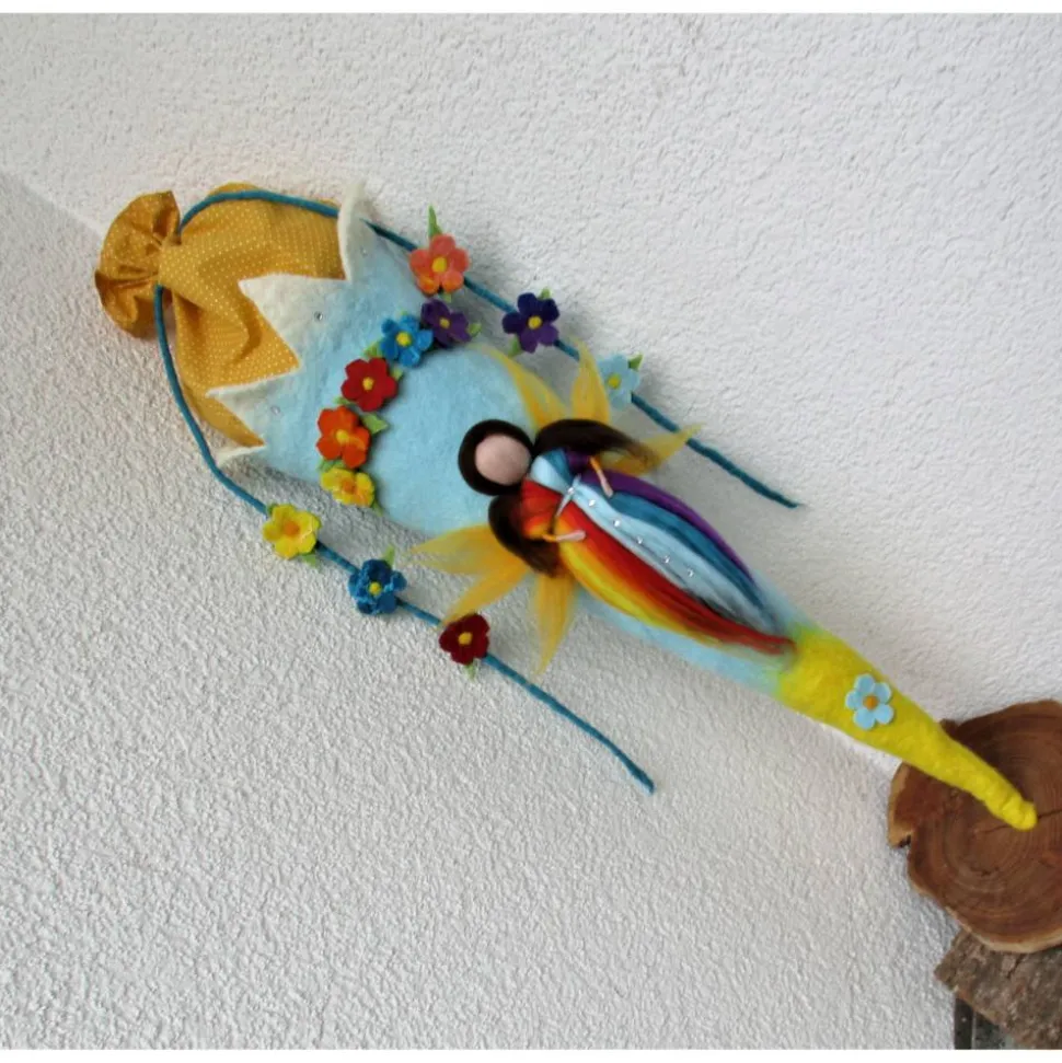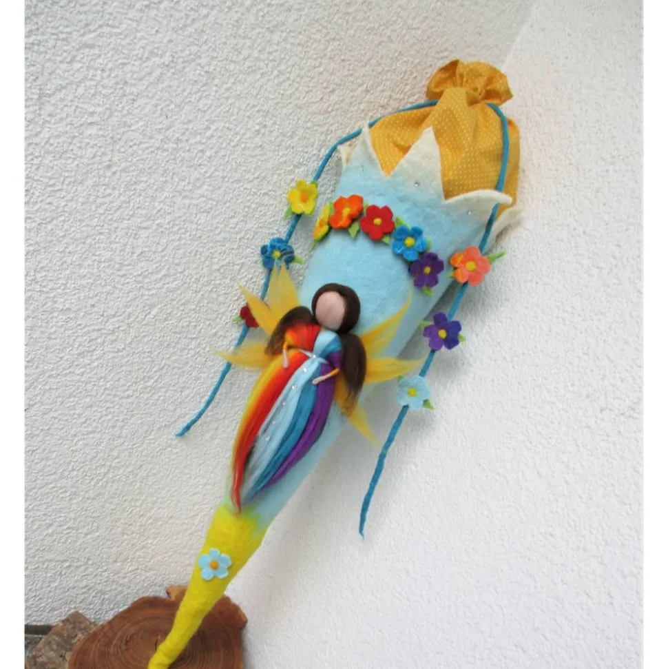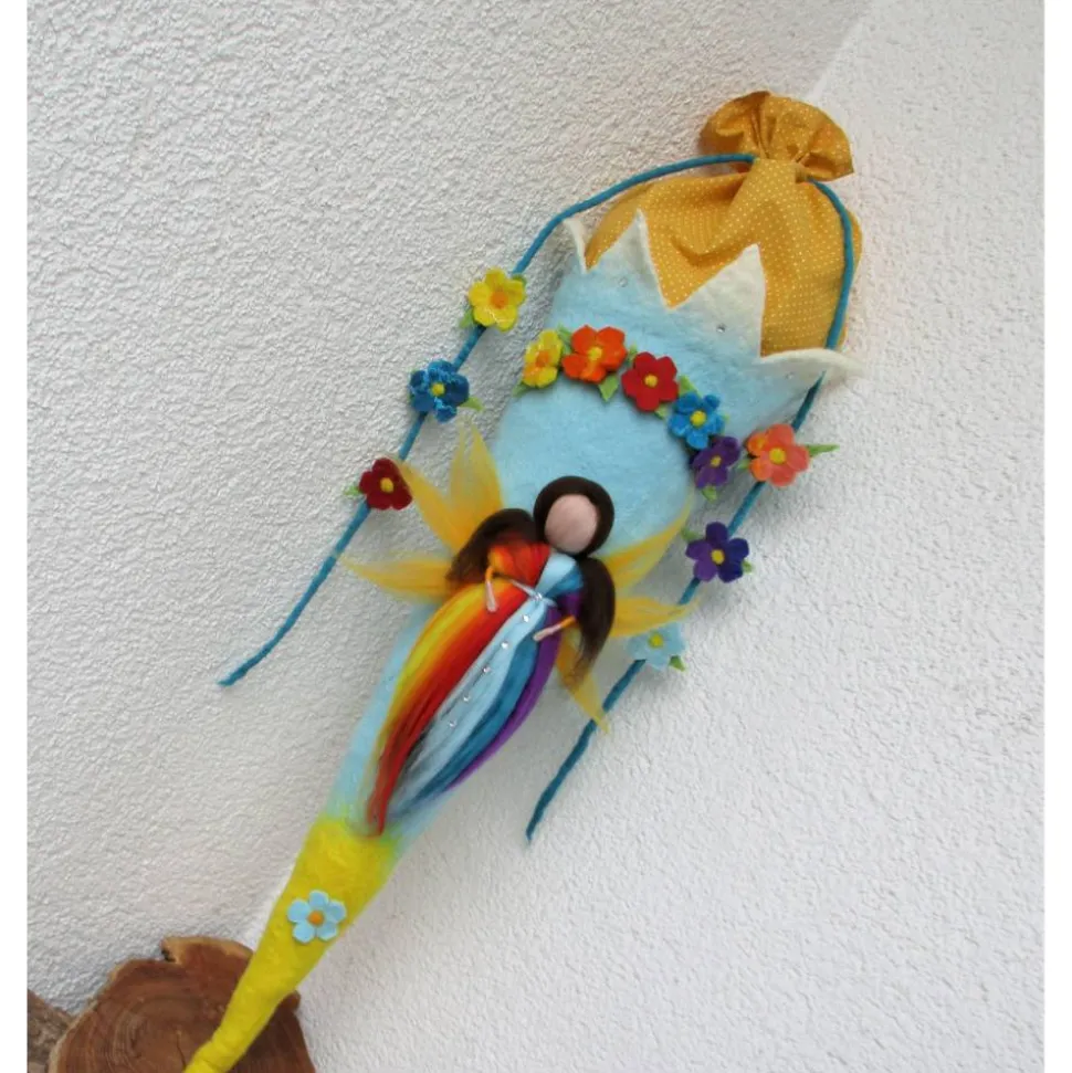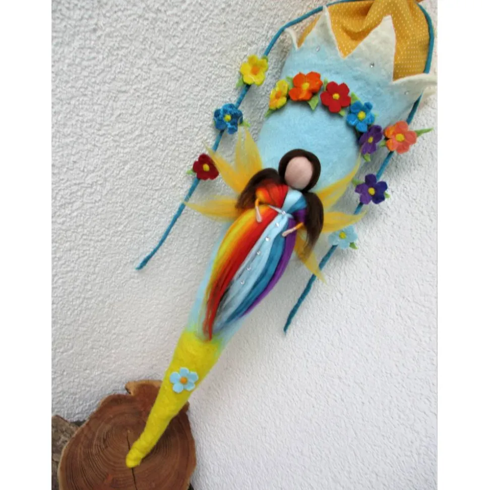 Diese Schultüte – Zuckertüte ist in aufwändiger Detailarbeit handgefilzt – geschmückt mit einer handgefilzten Elfe im Regenbogendesign.