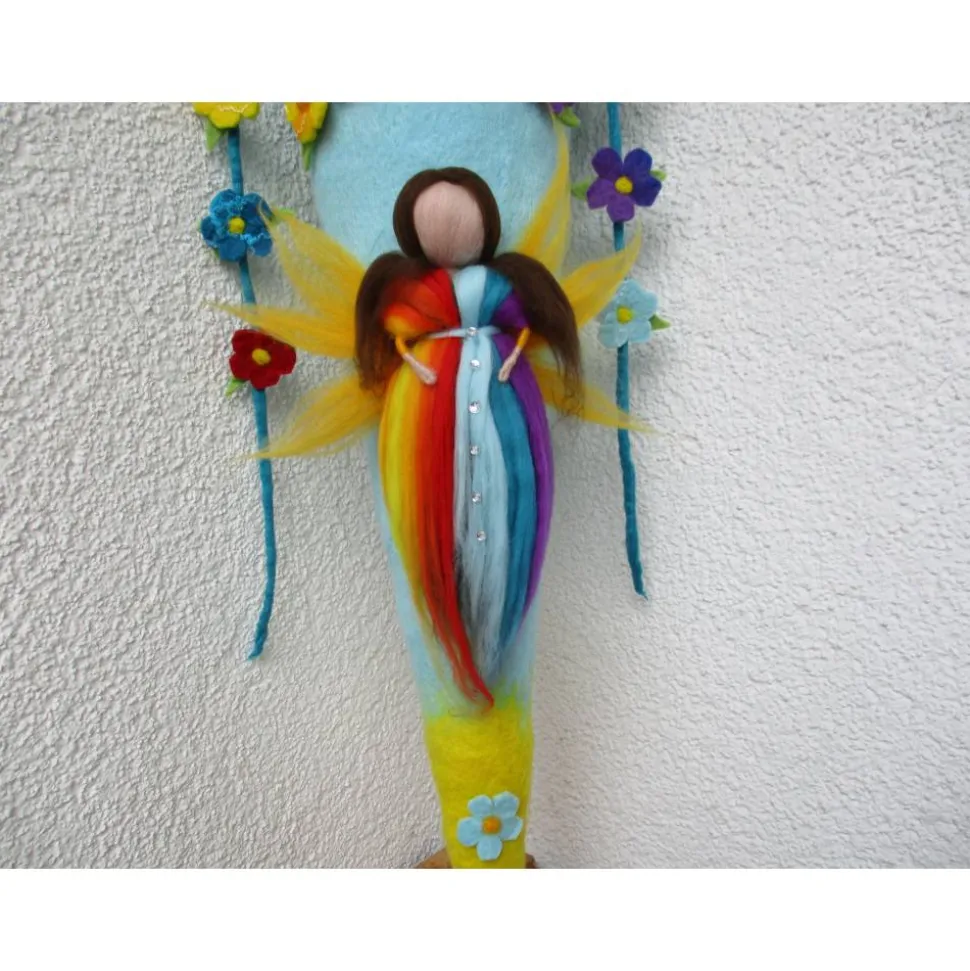 Oberhalb der Elfe sind kleine Filzblümchen fixiert, die zu einem Regenbogen gestaltet sind, ebenfalls in Regenbogenfarben.