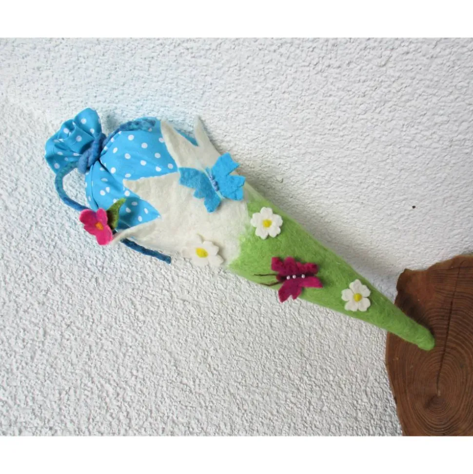 Handgefilzte Schmetterlinge und weiße Filzblumen sind auf der Schultüte fixiert.