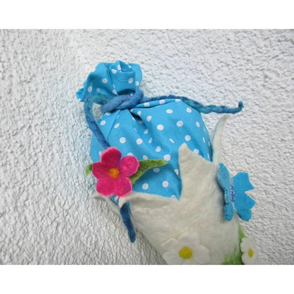 Das Band zum Zubinden ist mit einer Filzblume geschmückt