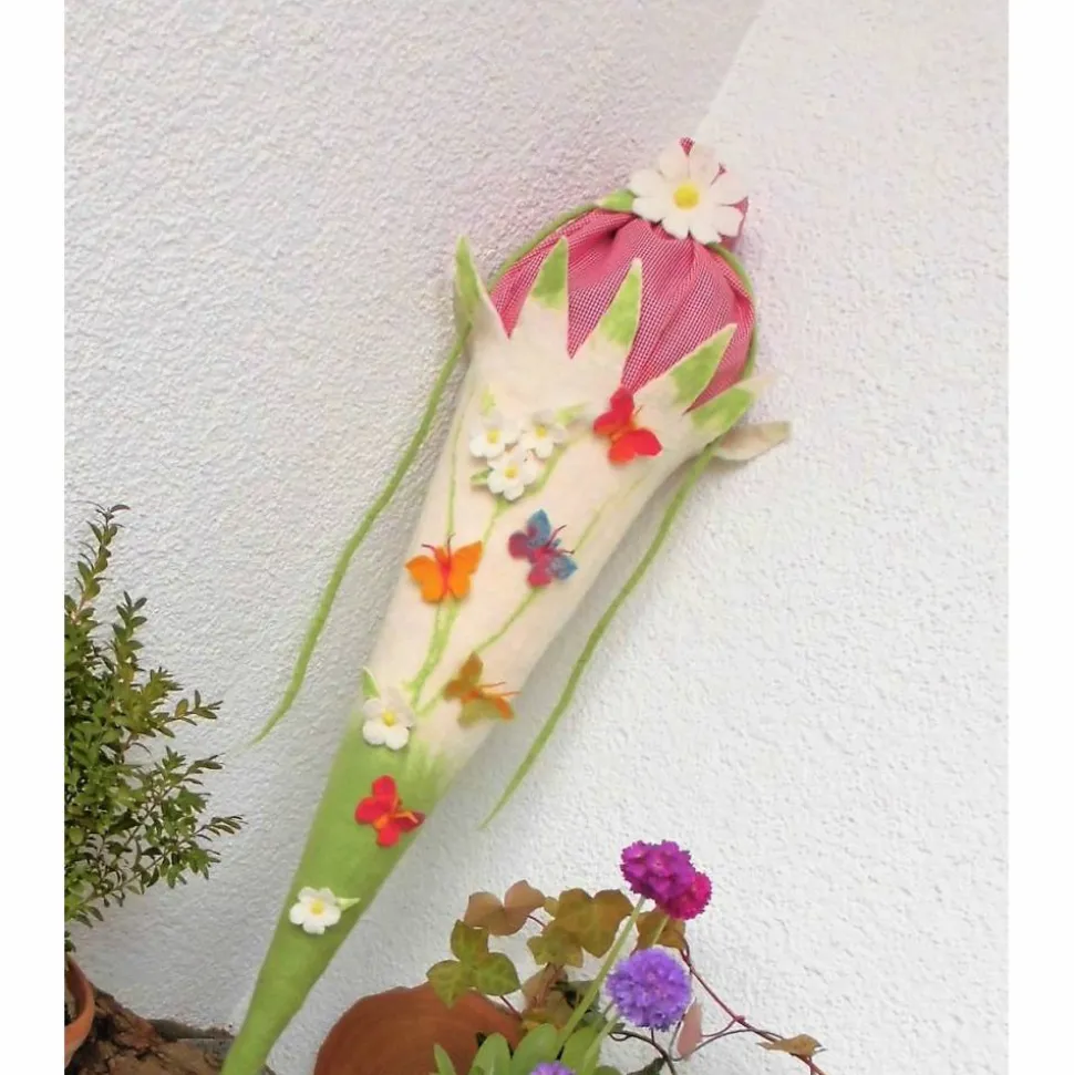 Der Schultütenkörper ist in altweiß und grün gehalten, daraufsind grüne Ranken eingefilztauf denen fröhlich bunte Schmetterlinge sitzen.