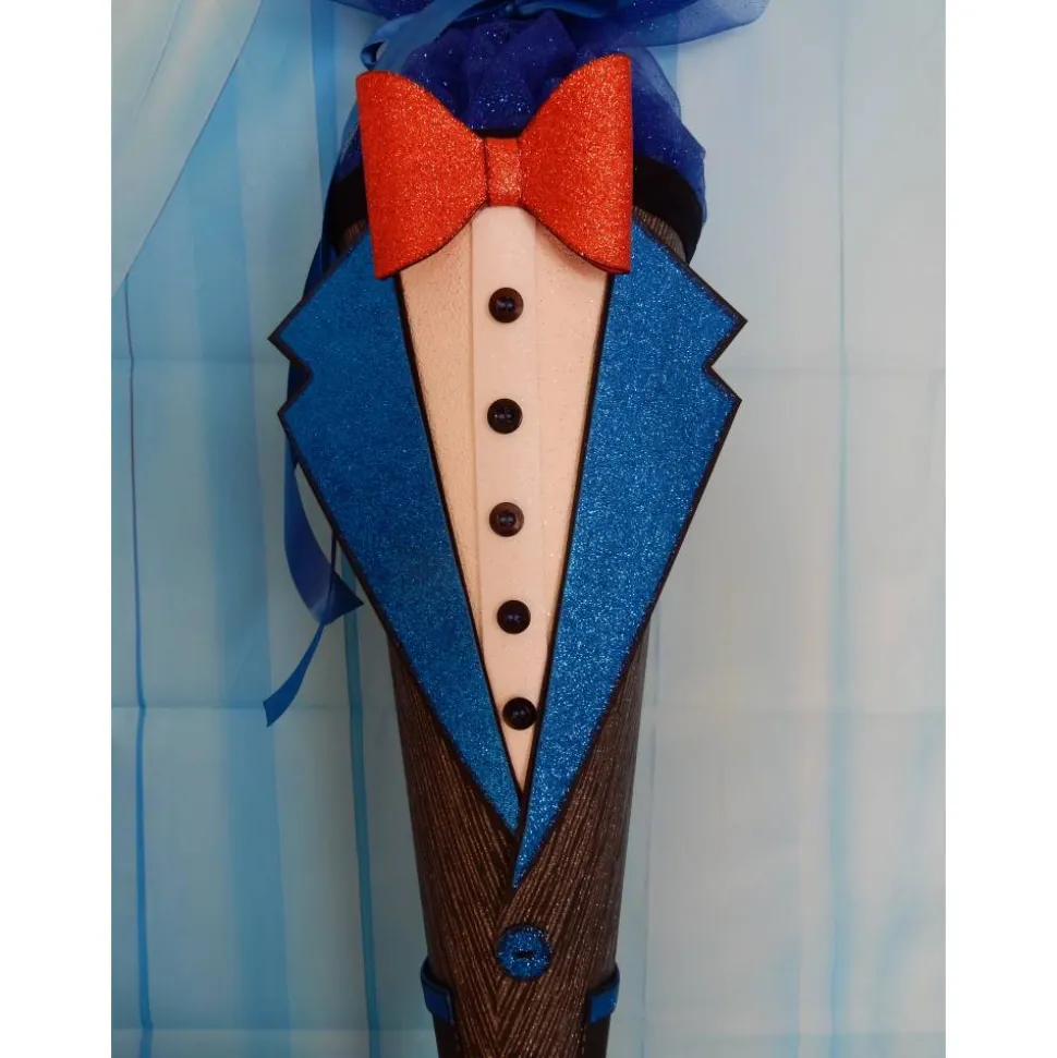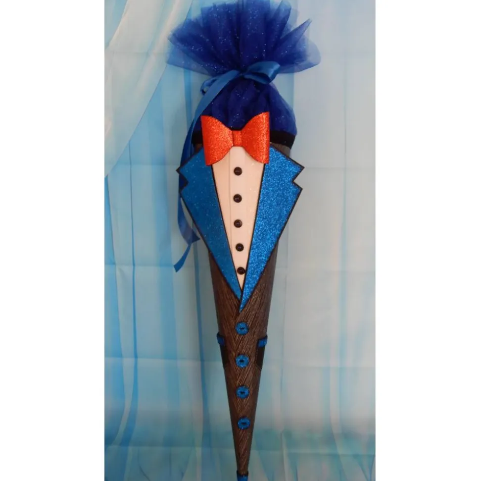 Diese Schultüte ist ein echter Hingucker und ideal für den ersten Schultag! Sie besteht aus stabilem Papier und ist mit viel Liebe zum Detail gestaltet. Das Design erinnert an ein stilvolles Outfit, komplett mit einem blauen Glitzer-Look, einer roten Fliege und dekorativen Knöpfen. Der obere Abschluss der Schultüte ist mit edlem, blauem Tüll versehen, der das Gesamtbild perfekt abrundet.