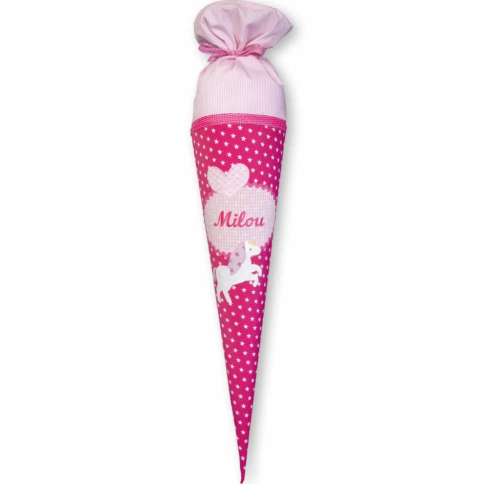 Handgefertigte Schultüte aus Stoff in den kräftigen Farben Pink und Rosa. Detailverliebt bestickt mit Einhorn und Herz.