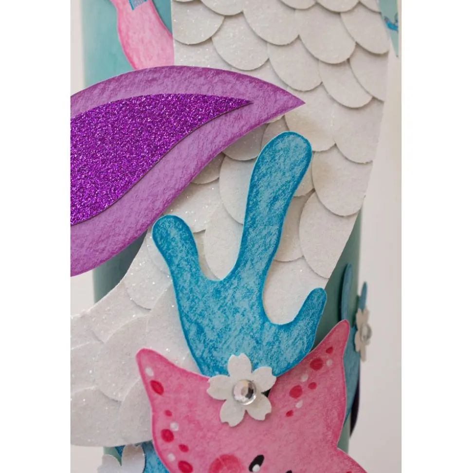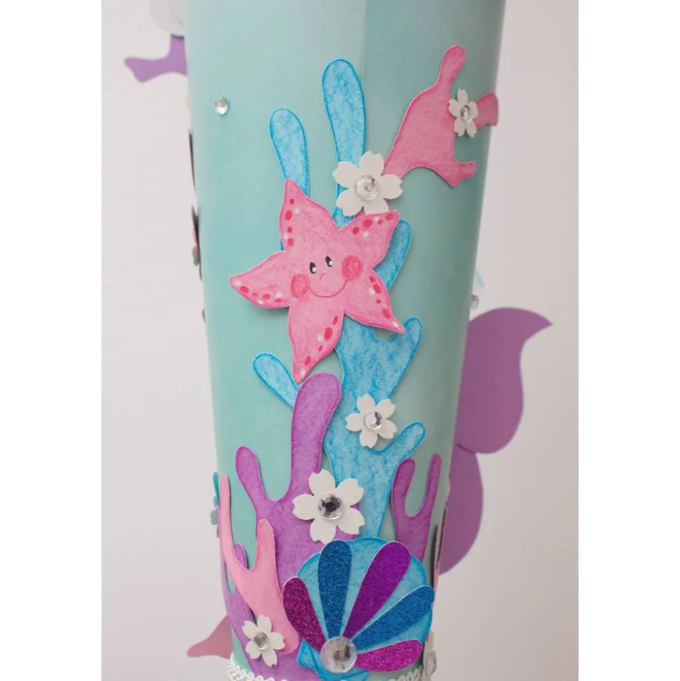 Der Schultütenrohling ist mit einem Motivkarton in hellblauer Aquarelloptik um klebt. Die Spitze ist aus einem Motivkarton mit Meerjungfrauen gefertigt. Die Manschette besteht aus drei Lagen. Ein besonderer Hingucker ist der rosa Tüll, mit rosa Glitzerpartikeln, der das weiße und violette Krepppapier in den Hintergrund rückt. Verschlossen wird die Manschette mit einen türkisen Satinband und Organzaband. Für einen sauberen Übergang sorgt eine weiße Bordüre, eine weiße Holzspitze bildet den Abschluss. Eine Verzierung aus Seesternen, Muscheln, Algen und Blüten umrunden den Schultütenrohling. Sie sind aus rosa, flieder und hellblauem Fotokarton und Glitterkarton in pink, lila, türkis und weiß gearbeitet, kristallklare Schmucksteine runden den Schultütenrohling ab.