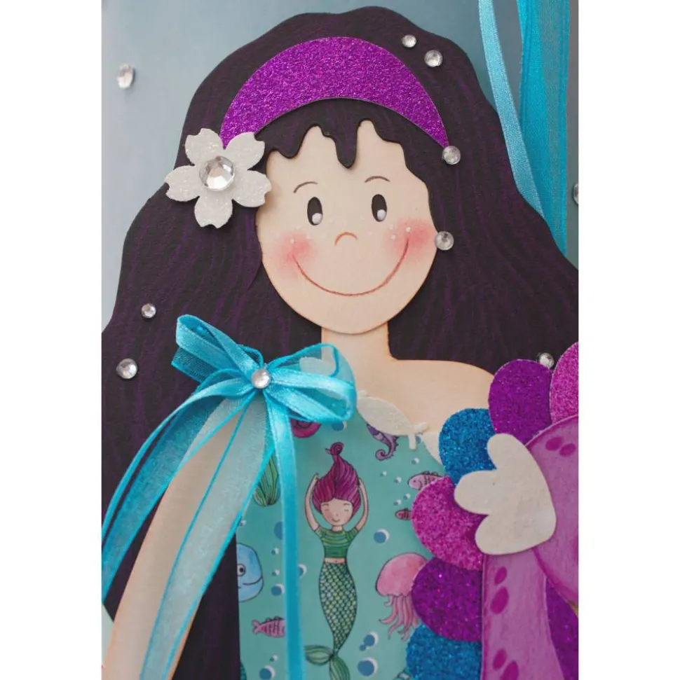 „Mollys“ wallendes, lila schimmerndes, schwarzes Haar, ist mit kleinen Schmucksteinen verziert. Weiße, glitzernde Schuppen ziehen sich bis zur Schwanzflosse, die sich in fliederfarben und glitzerlila absetzt. Das Oberteil und ihr Rock spiegeln den Motivkarton der Spitze wieder, die Schleife an ihrem Oberteil ist passend zum Verschluss gefertigt.