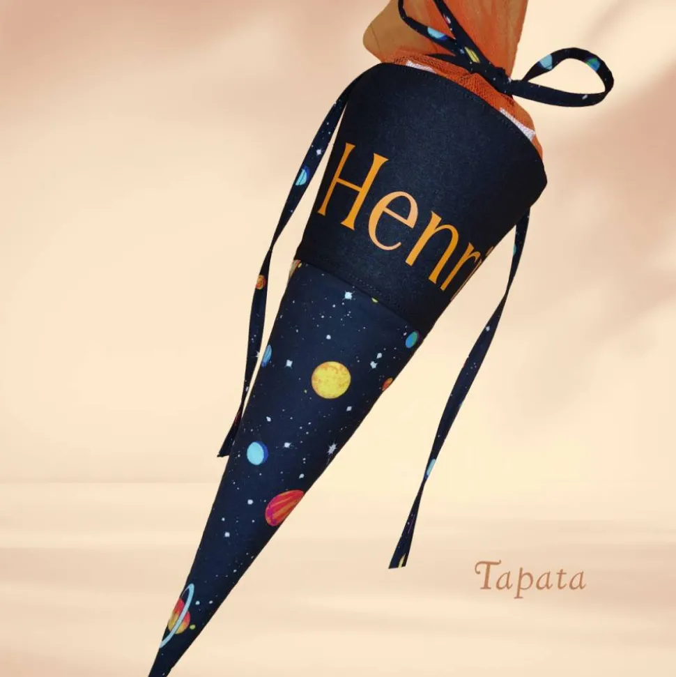 Schwarz mit Weltraum-Motiven. Name und Motiv aufgebügelt mit Flexfolie (Plottertechnik).