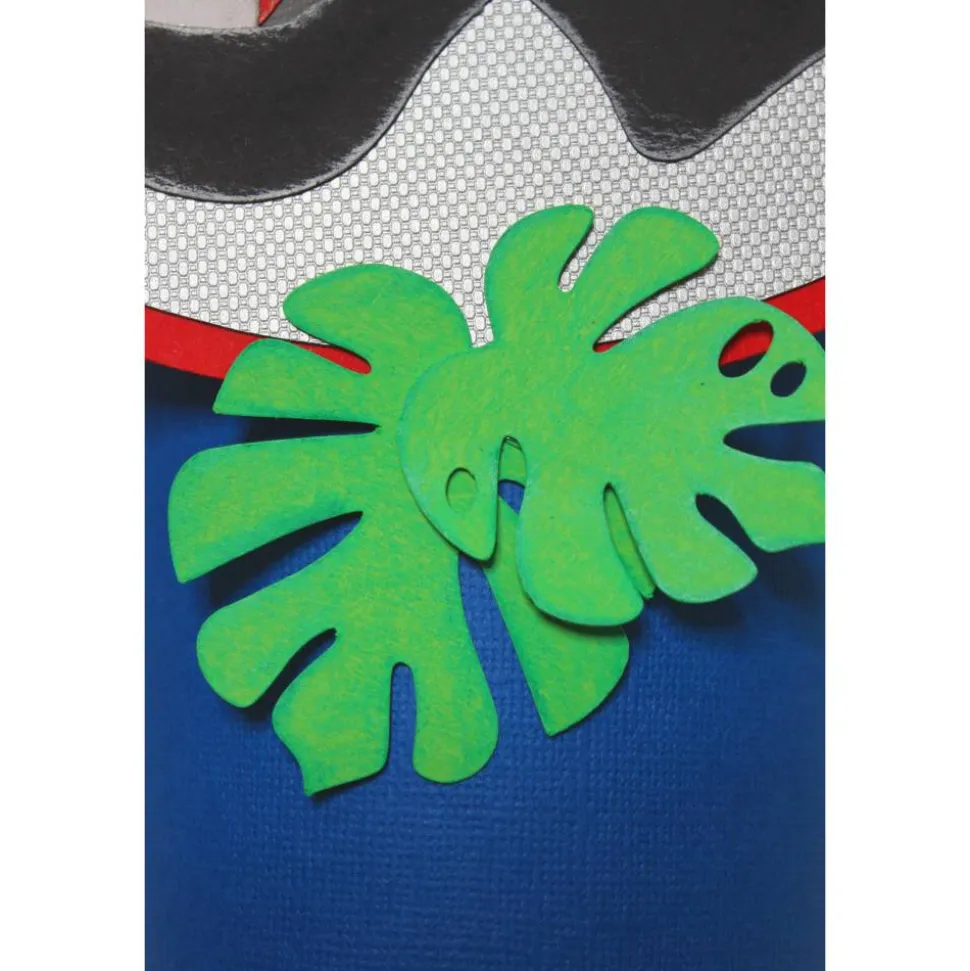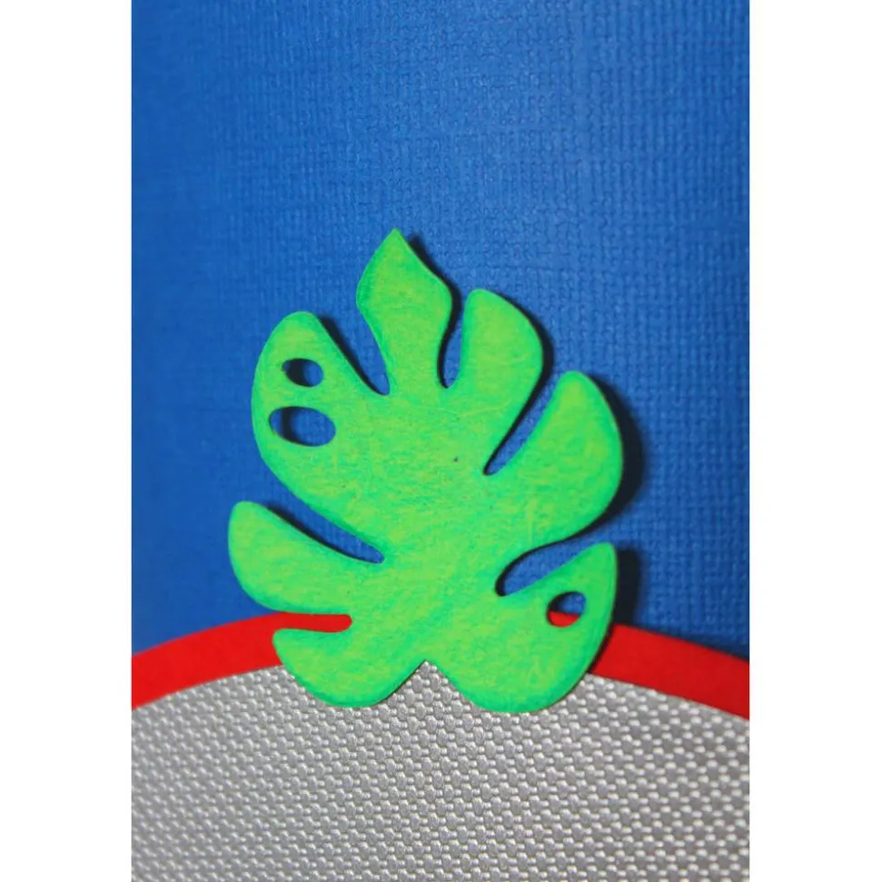Platziert ist der Kopf auf einem verstärkten Kreis aus rotem Fotokarton und silberner, strukturierter Folie. Die tropischen Blätter runden das harmonische Gesamtbild ab.