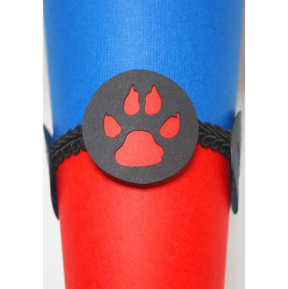 Die Manschette ist aus schwarzem und königsblauem Krepppapier gefertigt und wird mit einem roten Satinband und einer silbernen Kordel verschlossen.