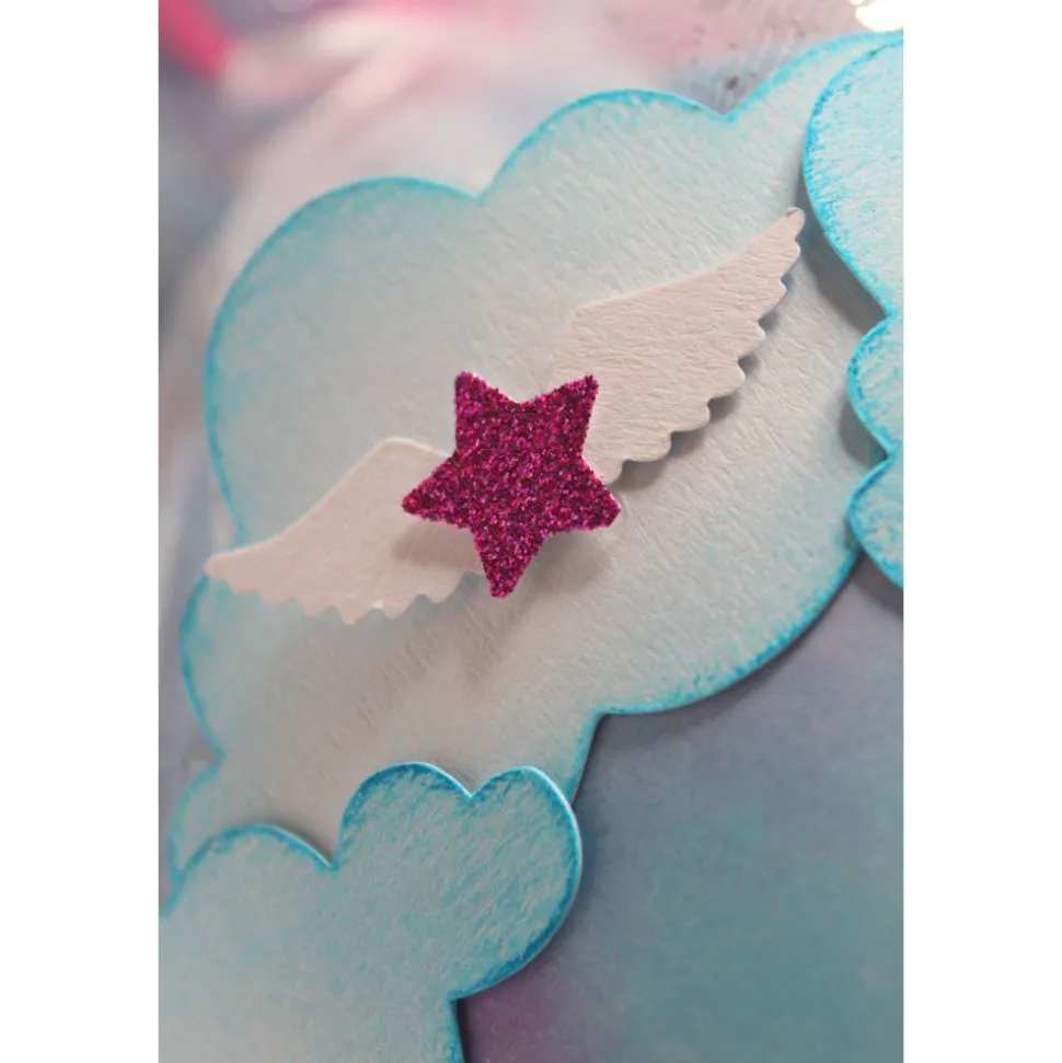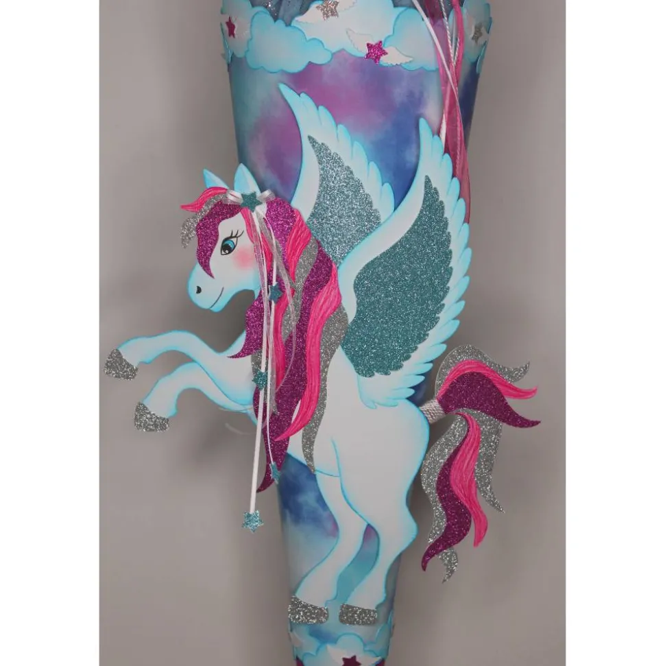 Der Schultütenrohling ist mit einem Motivkarton in Wölkchen, Aquarelloptik um klebt. Die Spitze ist aus einem Glitterkarton in pink gefertigt und eine weiße Holzspitze bildet den Abschluss. Die Manschette besteht aus drei Lagen. Ein besonderer Hingucker ist der weiße Tüll, mit silbernen Glitzerpartikeln, der das pastellblaue und pinkfarbene Krepppapier in den Hintergrund rückt. Verschlossen wird die Manschette mit einem weißen Satinband, weißer Kordel und einem Oraganzaband in pink. Rund um die Manschette und der Spitze reihen sich viele Wölkchen aneinander, die mit glitzernden Sternen und Engelsflügeln verziert sind.