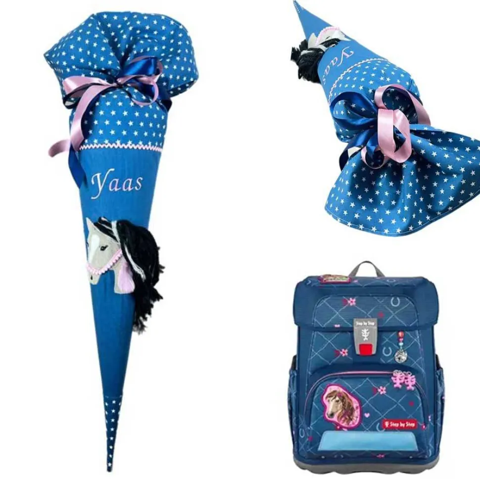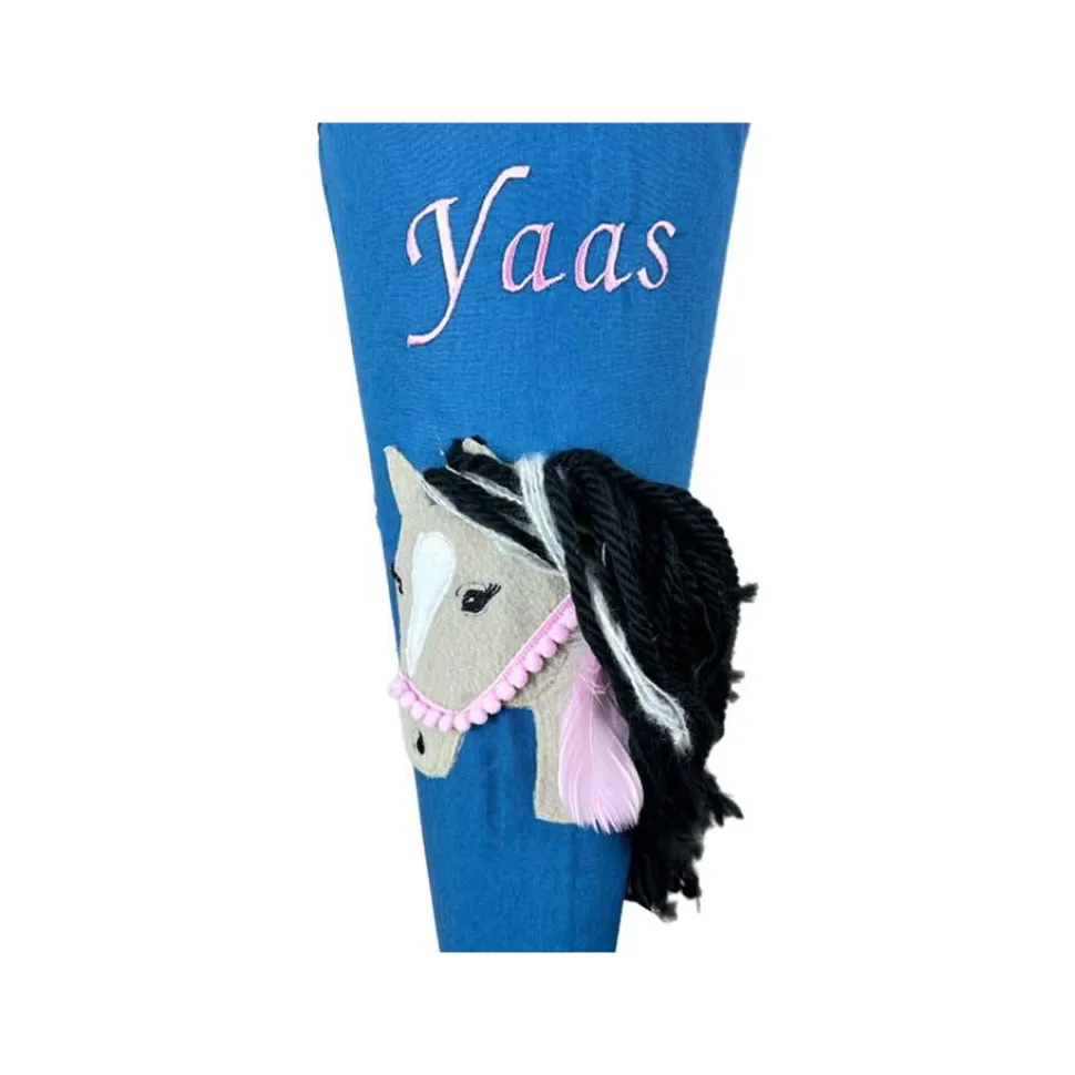 Pünktlich zum Schulanfang haben wir viele neue Schultüten aus Stoff für Jungs und Mädchen passend für 70 cm Papprohlinge entwickelt. Ab sofort könnt ihr unser Modell Schultüte Pferd mit Namen personalisieren und bequem online kaufen. Wir haben diese große Schultüte in Anlehnung an den Schulranzen Step by Step Horse Lima angefertigt. Die Pferde Applikation auf der personalisierbaren Zuckertüte hat ein weiches, braunes Fell mit einer weißen Blesse. Die Mähne des Pferdes ist detailreich mit Blumen und Schmuckbändern verziert und das Zaumzeug ist aus Pompom Borte aufwändig aufgenäht. Du erhälst für Dein Kind eine hochwertige Pferde Schultüte mit vielen wunderschönen Details, die die Einschulung zu einem unvergesslichen Ereignis werden lässt.