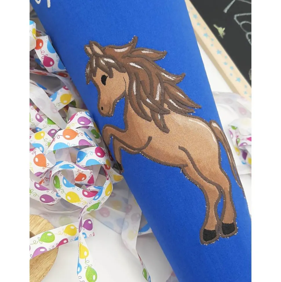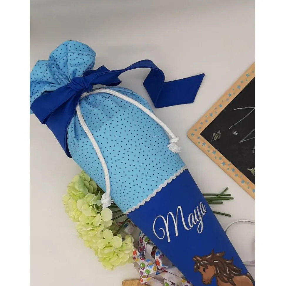Hier bekommtst du eine klassisch runde Schultüte mit einer tollen Stickerei.