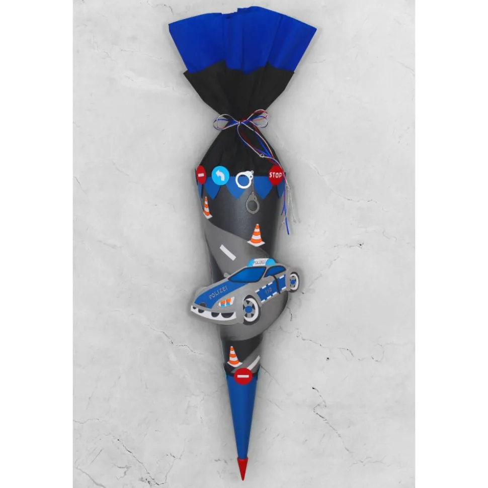Der Schultütenrohling ist mit einem leicht glänzenden, schwarzen Strukturkarton um klebt. Die Spitze und die Ornamente am Manschettenrand, sind aus einem blauen Strukturkarton abgesetzt. Die Manschette ist aus blauem und schwarzem Krepppapier gefertigt und wird mit einem blauen Satinband, einer silbernen Kordel und rotem Organzaband verschlossen. Für einen sauberen Übergang sorgt eine schwarze Bordüre, eine rote Holzspitze bildet den Abschluss. Verschiedene Verkehrszeichen, sowie Handschellen aus Fotokarton verzieren den Manschettenrand und die Spitze.
