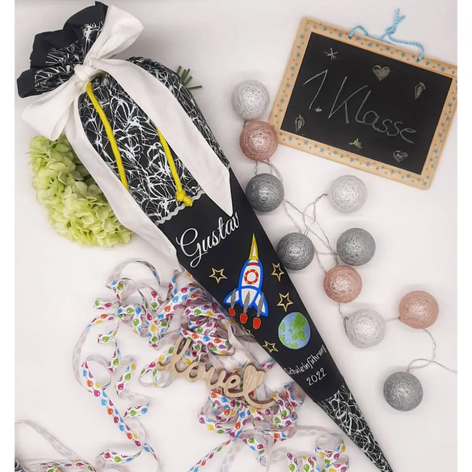 Die Schultüte wird mit dem Namen des Kindes und z.B. Schulkind 202* bestickt.